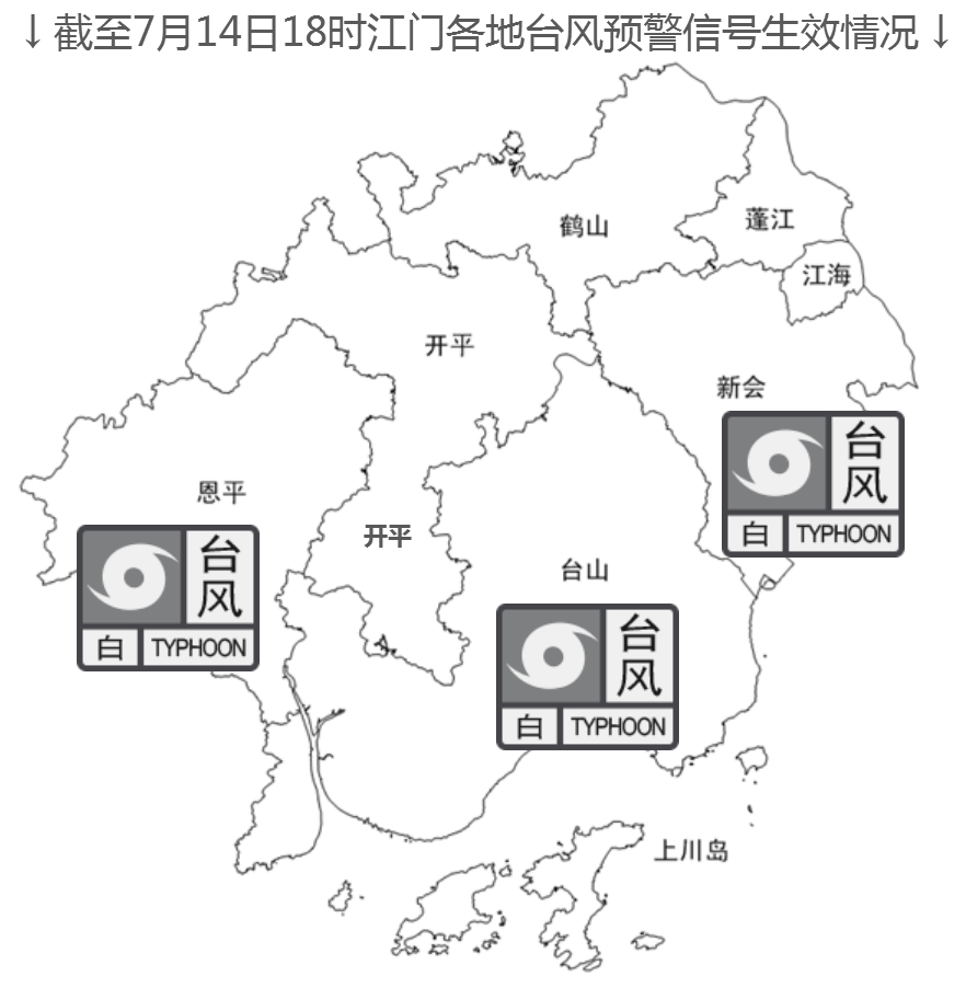 截至7月14日18时,台山、新会、恩平已发布台风白色预警信号,后期随着台风发展、移近,江门市各地还可能继续发布或升级相关预警信号,请密切关注最新预报预警信息。
