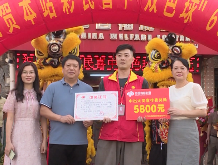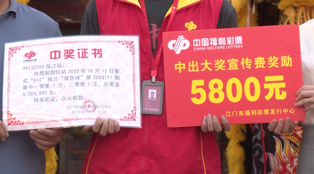 10月16日下午,江门、台山两地民政局在售出该彩票的投注站举行了颁奖仪式,向该投注站送上喜报。