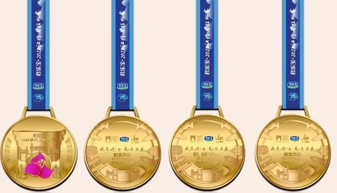 在奖牌设计方面,本届江门马拉松赛奖牌设计讲究“天圆地方”:造型为正圆形,寓意包容万物;奖牌正面的“门”字图案代表“方”,寓意为广大跑友开门,广迎各地跑友群聚江门,用脚步丈量“江马”赛道,领略侨乡特色美景。此外,“门”字图案中间是醒目的江门市花簕杜鹃,颜色鲜艳,生机盎然,寓意“开门红”,祝福广大跑友年底参加江门马拉松赛,新的一年喜迎“开门红”。奖牌背面以圆形线条串联江门地标建筑剪影,中间展示江门文旅“门”字标志、赛事信息、赛事口号、赞助商等信息。