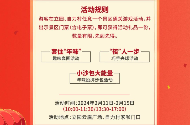内容:景区结合本土文化特色打造喜庆祥和浓厚的龙年春节氛围,为游客提供一次充满年味和互动感的旅游体验。套住“年味”,趣味套圈、“筷”人一步,巧手夹球、小沙包大能量,年味投掷沙包等活动,有趣好玩,还有机会赢取礼品。