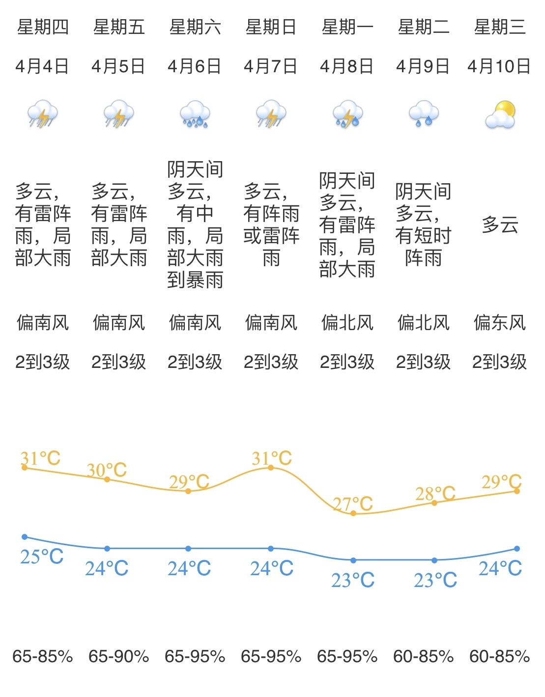 4日,多云,有雷阵雨,局部大雨,25到31℃;