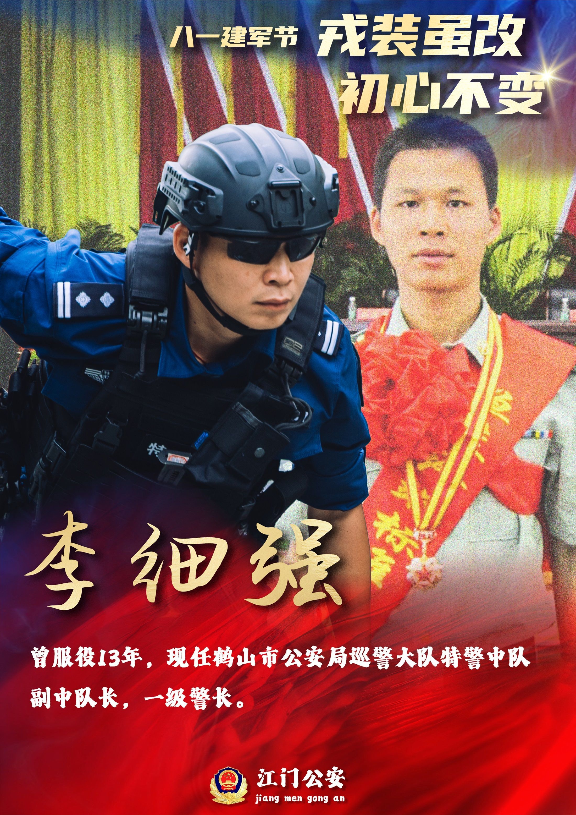 李细强,中共党员,曾在广州军区某集团军服役13年2个月,现任鹤山市公安局巡警大队特警中队副中队长。
