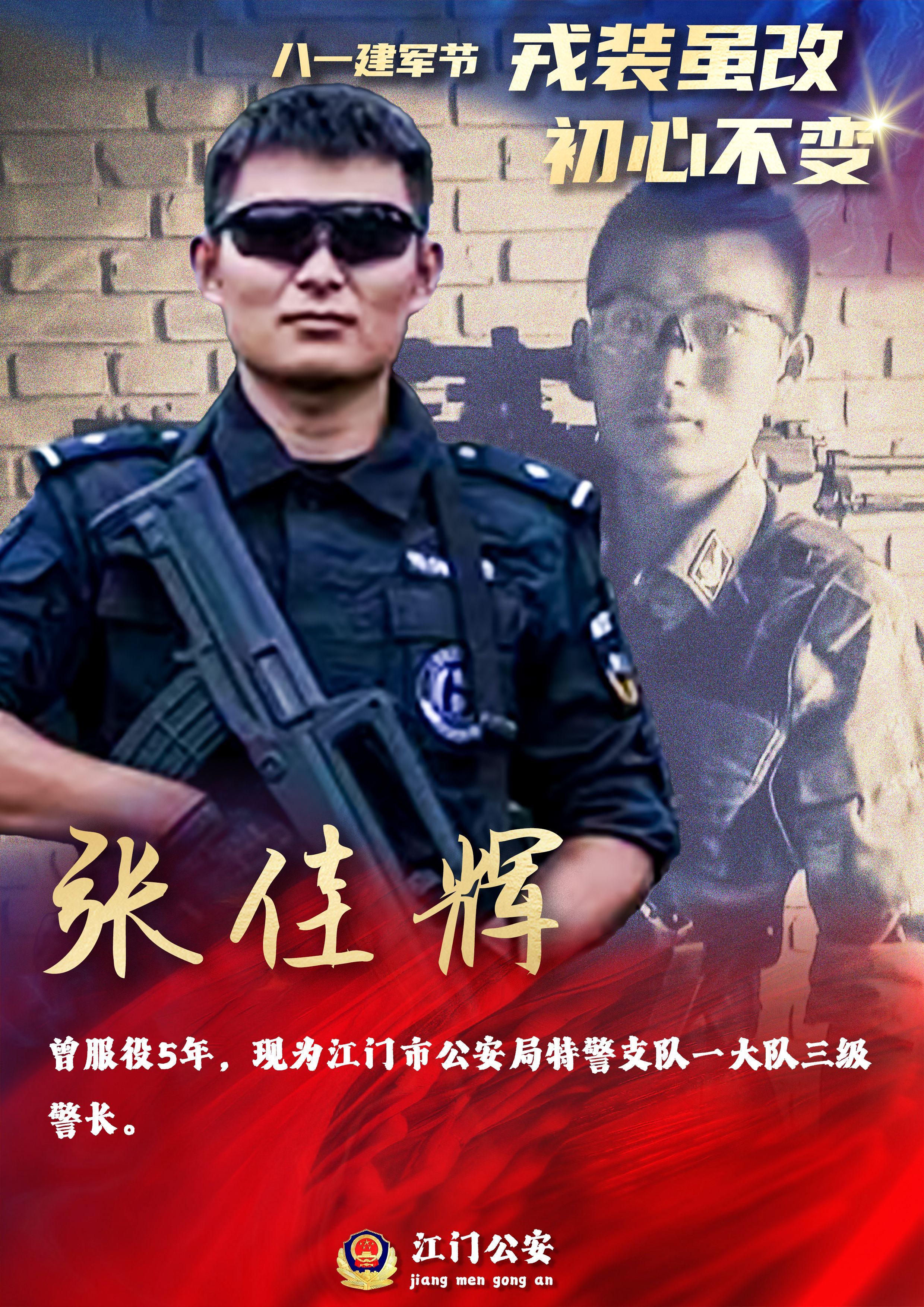 张佳辉,中共党员,2009年12月在武警总部直属支队服役,2014年11月退伍,服役5年。现为江门市公安局特警支队一大队三级警长。