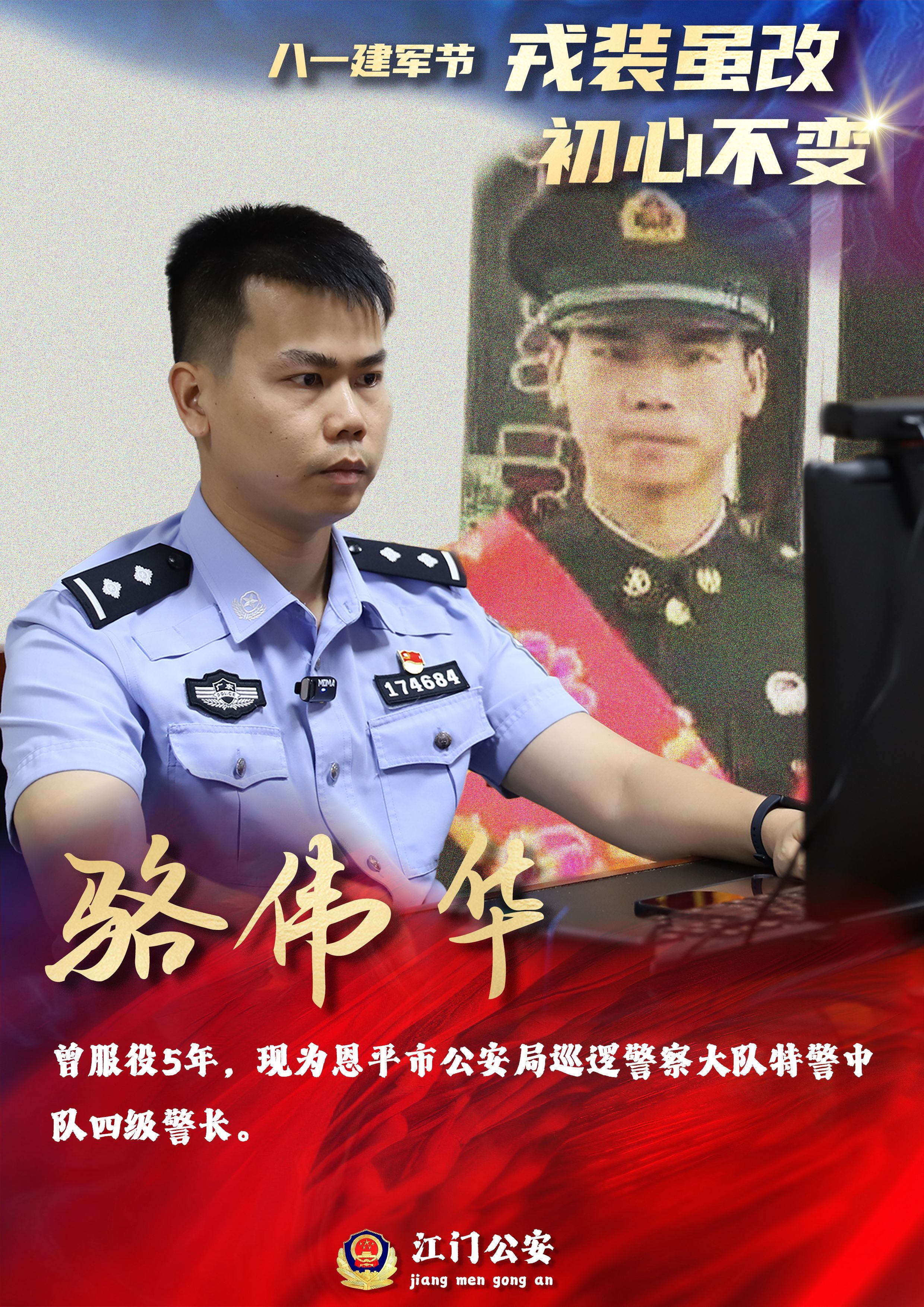 骆伟华,男,1992年7月出生,中共党员,2017年9月参加公安工作。曾在中国人民解放军某集团军服役。现任恩平市公安局巡逻警察大队特警中队民警。