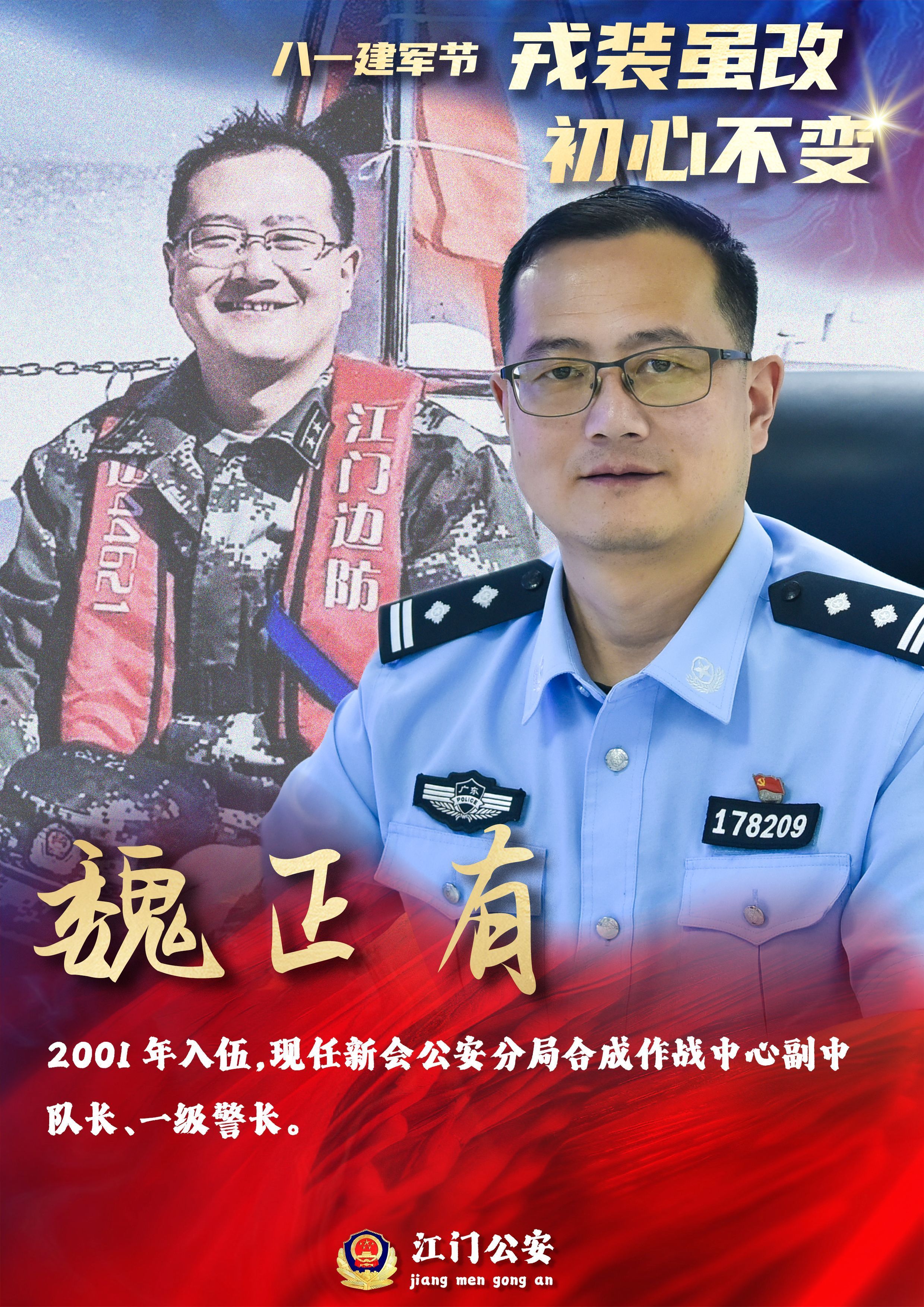 魏正有,男,汉族,中共党员,2001年12月入伍广东边防总队,2019年1月由边防部队转改退出现役,转为人民警察,现任江门市公安局新会分局合成作战中心一级警长、副中队长。