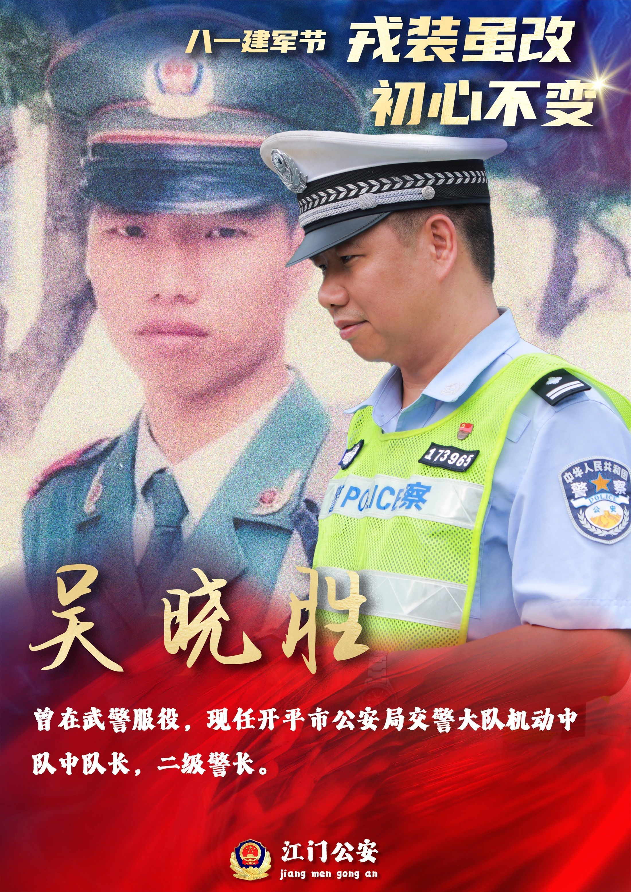 吴晓胜,男,45岁,中共党员,曾在武警广西总队某支队服役,2003年参加公安工作,现任开平市公安局交警大队机动中队中队长。从警21年来,他一直在巡特警工作,始终坚持为民初心不改,忠诚担当奉献。