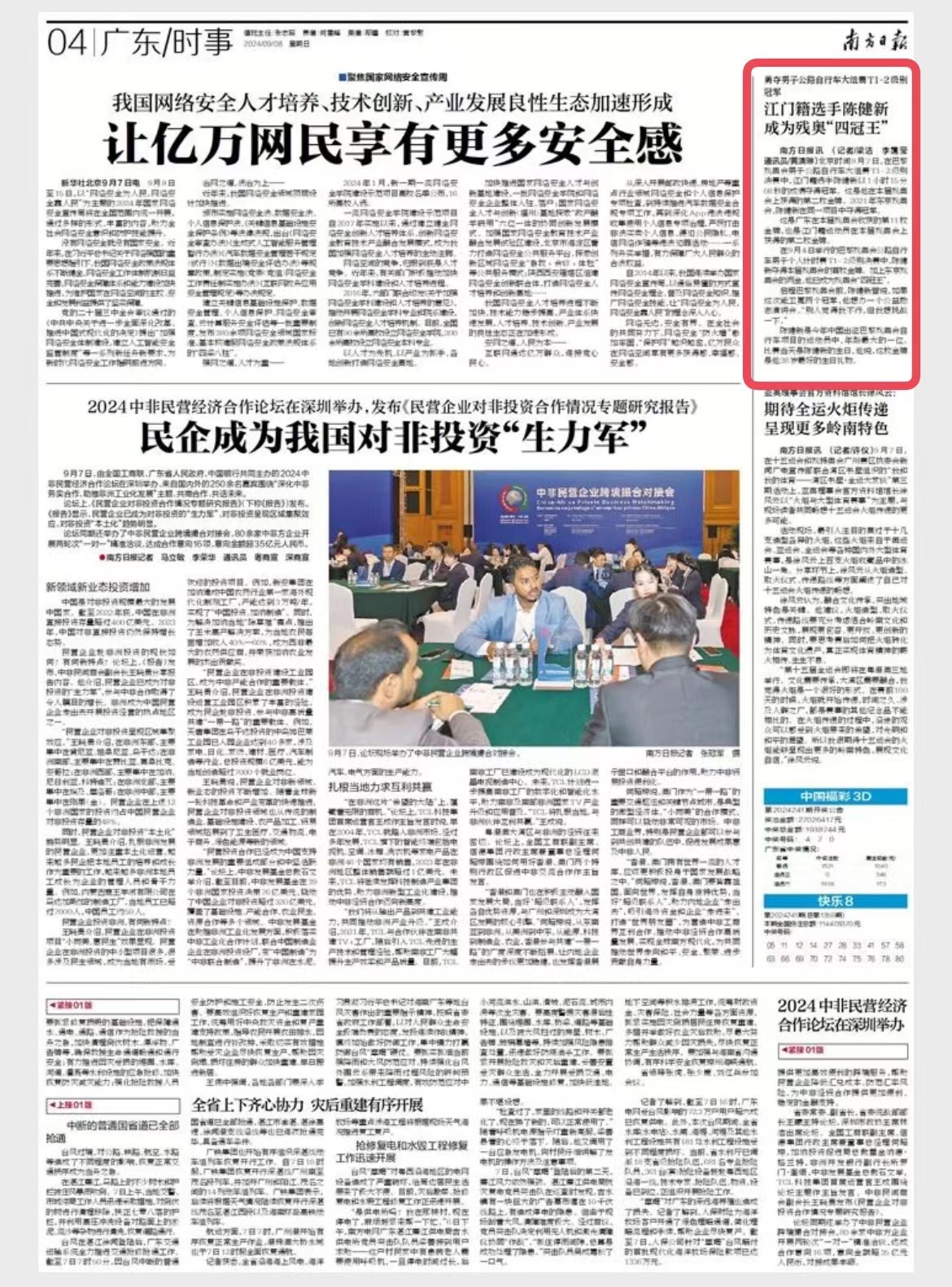 在3天前的巴黎残奥会公路自行车男子个人计时赛T1-2级别决赛中,陈健新夺得本届残奥会的第一面金牌。加上东京残奥会的两金,他已成为残奥会“四冠王”。