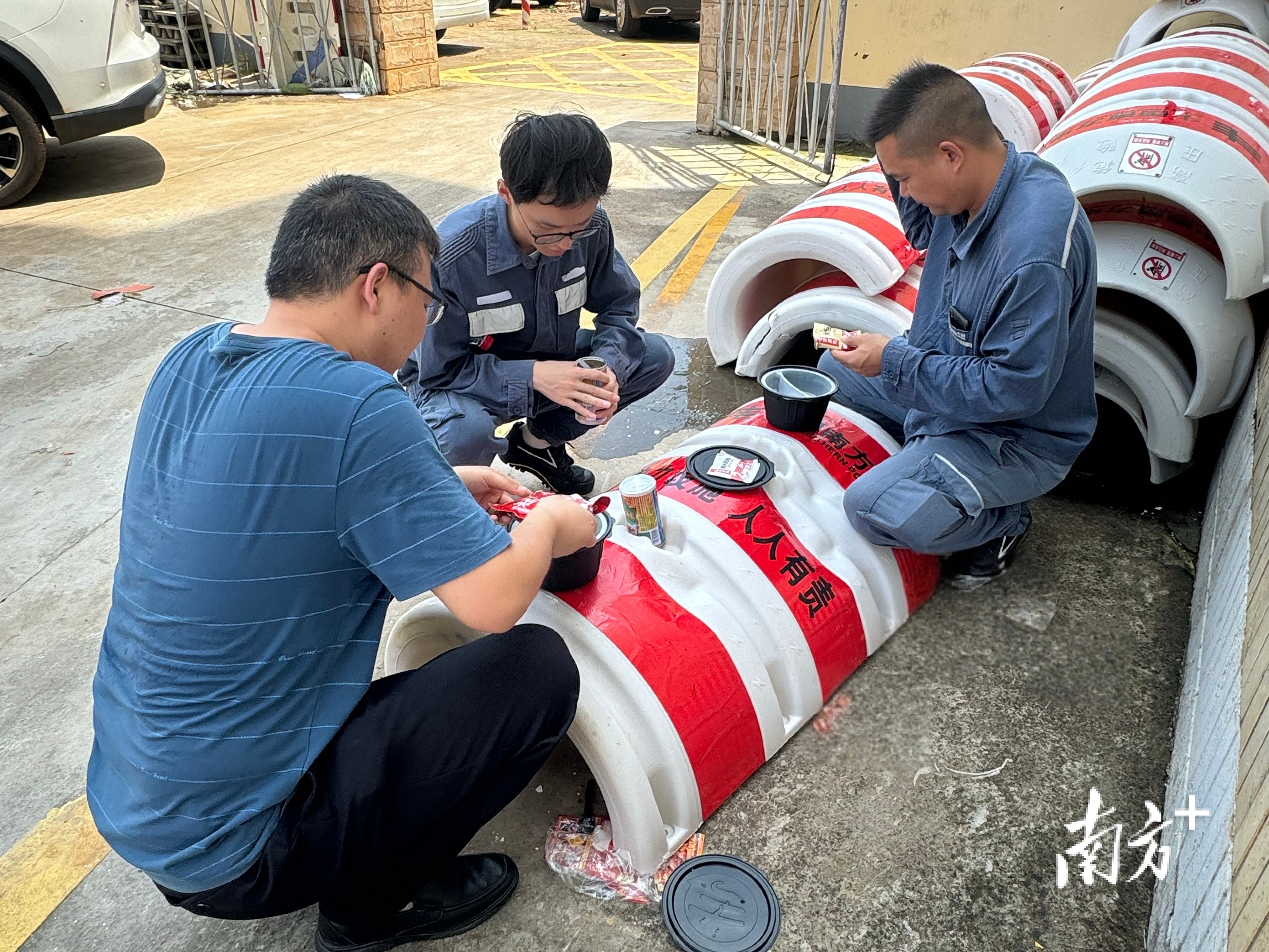 抢修人员抵达徐闻县海安镇后,简单吃过午饭,又投入到紧张的抢修工作中。受访者供图
