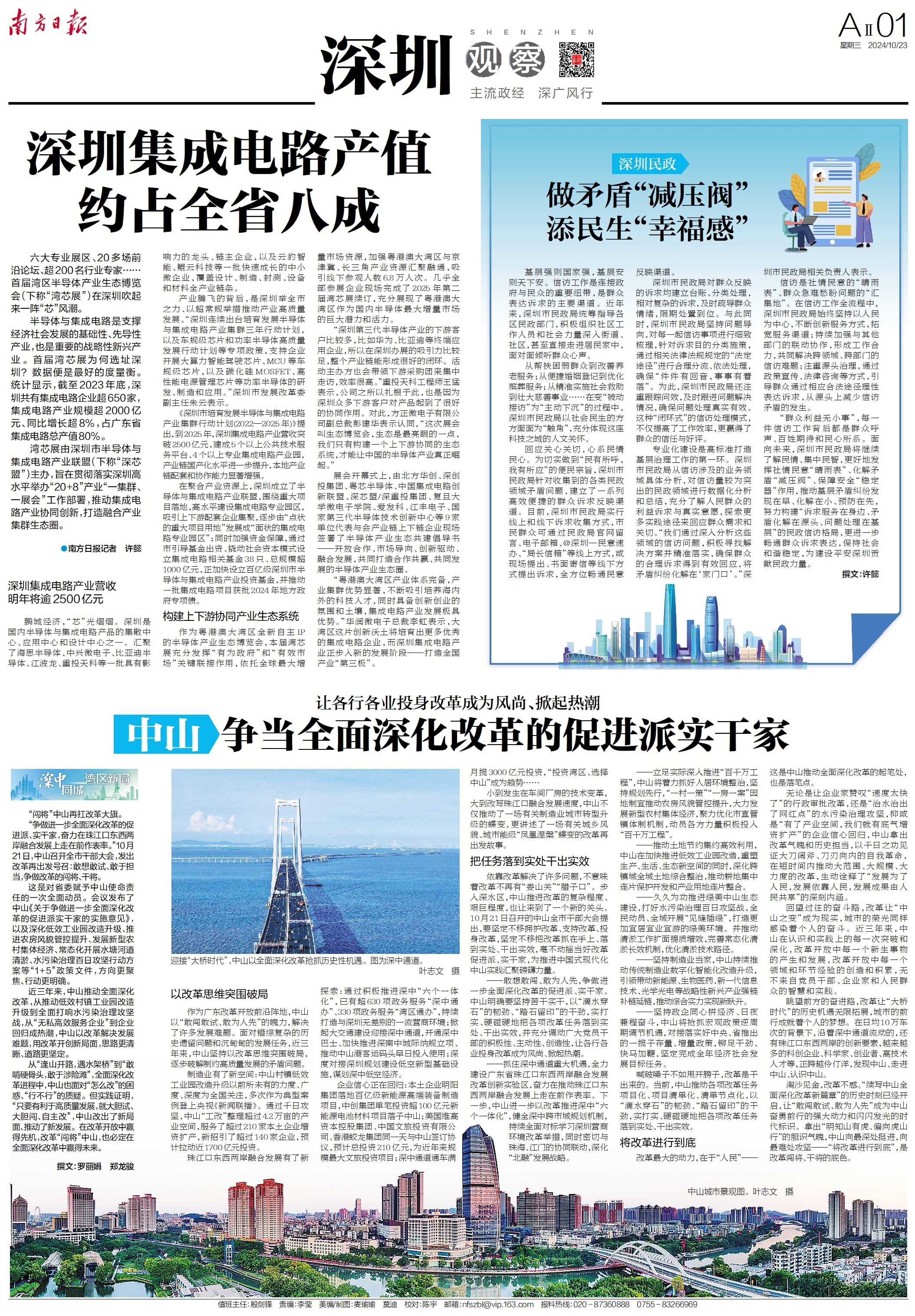 ——抓住深中通道重大机遇,全力建设广东省珠江口东西两岸融合发展改革创新实验区,奋力在推动珠江口东西两岸融合发展上走在前作表率。下一步,中山将进一步以改革推进深中“六个一体化”,健全深中跨市域规划机制,持续全面对标学习深圳营商环境改革举措,同时密切与珠海、江门的协同联动,深化“北融”发展战略。