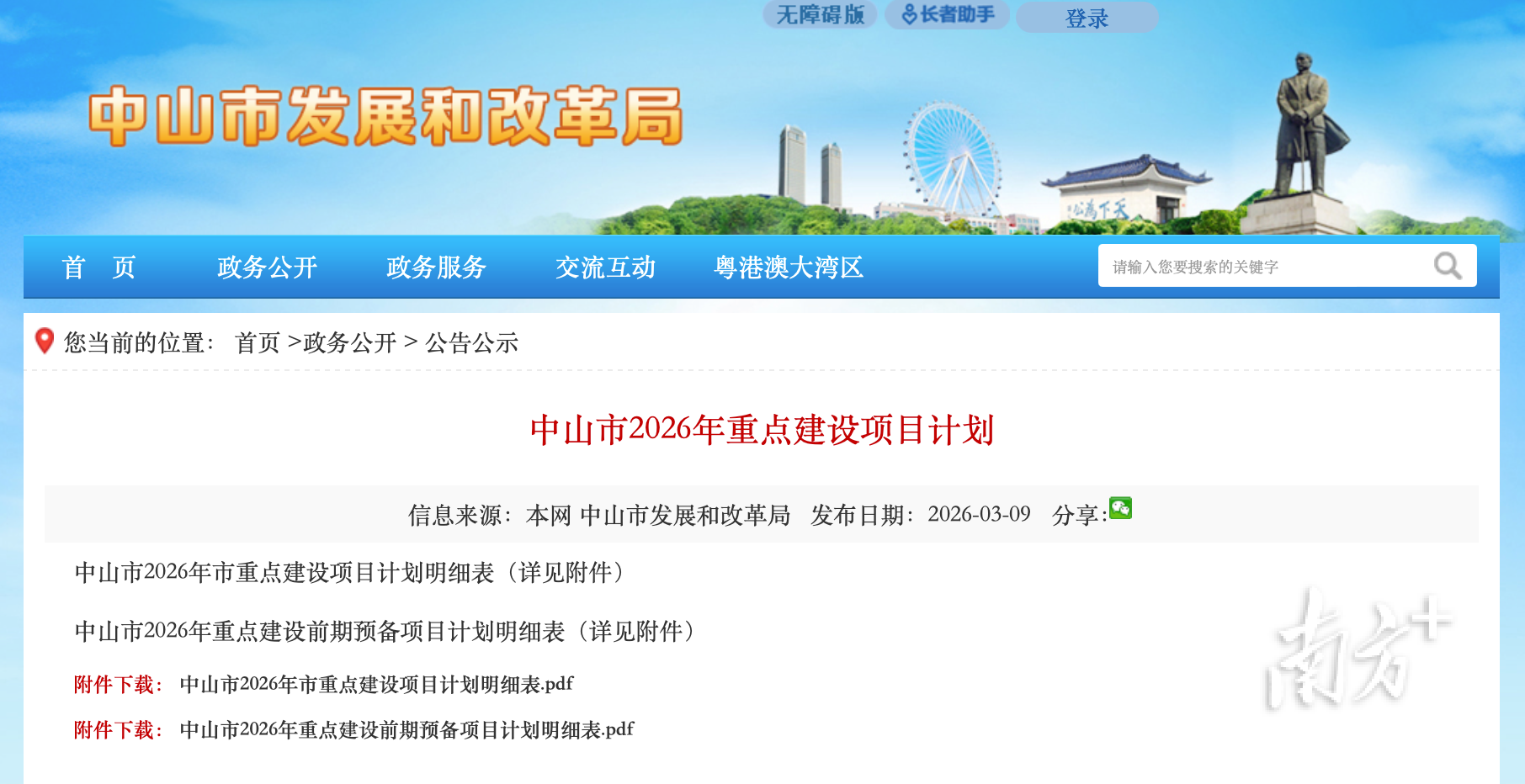中山市发展和改革局发布《中山市2026年重点建设项目计划》。 受访者 供图