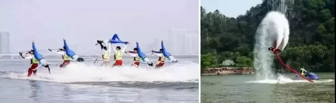 本次组队由著名全国亚洲花样冠军史隆飞教练带领一行16名队员为我们表演水上飞人、滑水空翻、水上叠罗汉、摩托艇高速特技表演,其中还邀请了水上动力滑板为我们展示水上漂的特技表演,带给观众精彩刺激的超视觉盛宴。