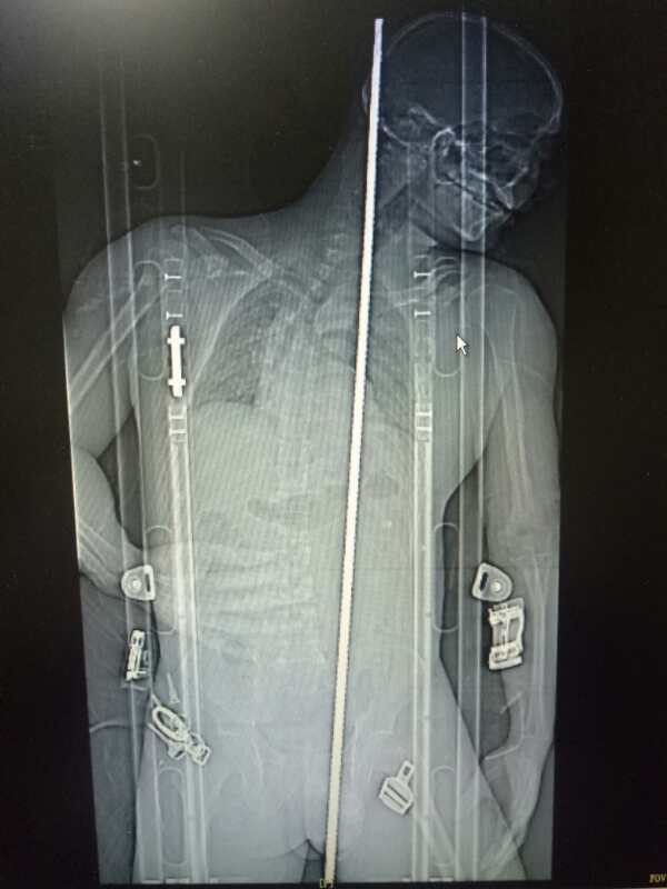 本月18日,建筑小哥伍某在东凤工地上扎钢筋时,因脚踩木板突然断裂,不慎从近3米高的钢结构架上跌落,不料下面正立着一根长1.5米,直径1公分多的钢筋管,在快速坠落过程中伍某几乎整个身体穿入钢管中。钢筋管从他的左侧阴囊穿入,经过盆腔、腹腔、胸腔……直至从颈部顶骨后方穿出,留于体内的长度达1.1米。