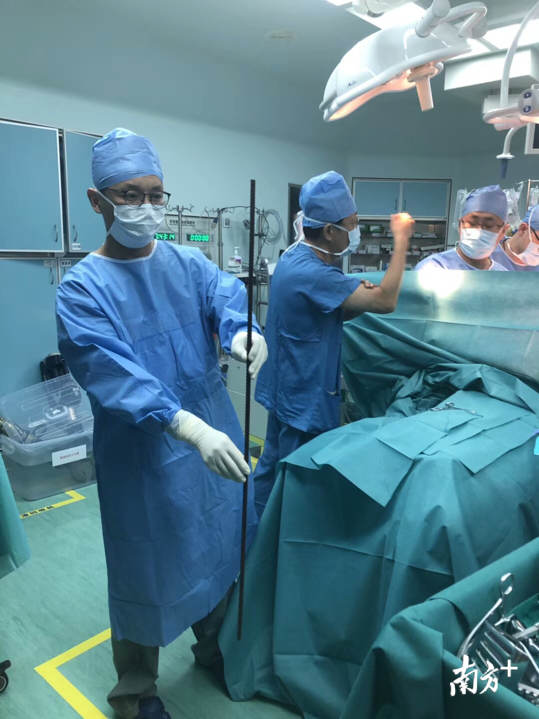 最终,经过多学科专家会诊,确定手术由心胸外科牵头,其它各大外科及消防官兵术中待命,采取胸腹联合切口的形式展开,并以“原路返回”的方法将钢筋从体外整体拔出。“这台手术略为特殊,由于钢筋贯穿身体,患者不能移动、卧躺,整个5小时的手术只能以患者45度侧卧的体位进行,医生要弓着腰甚至半蹲着才能手术。”王尧说。