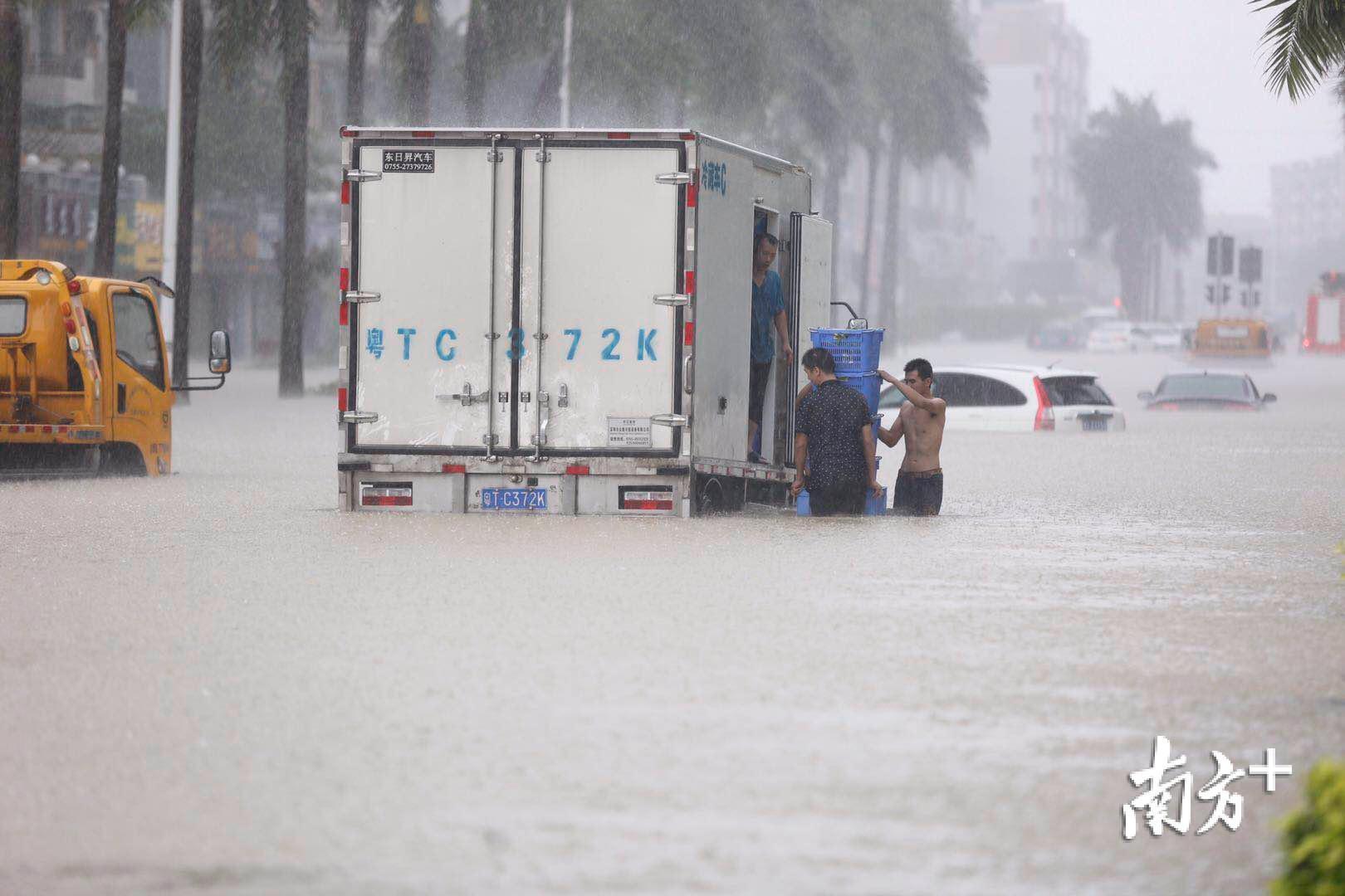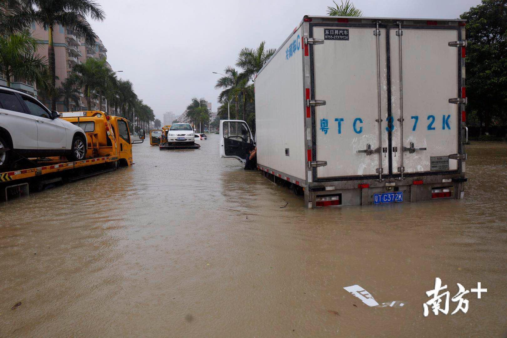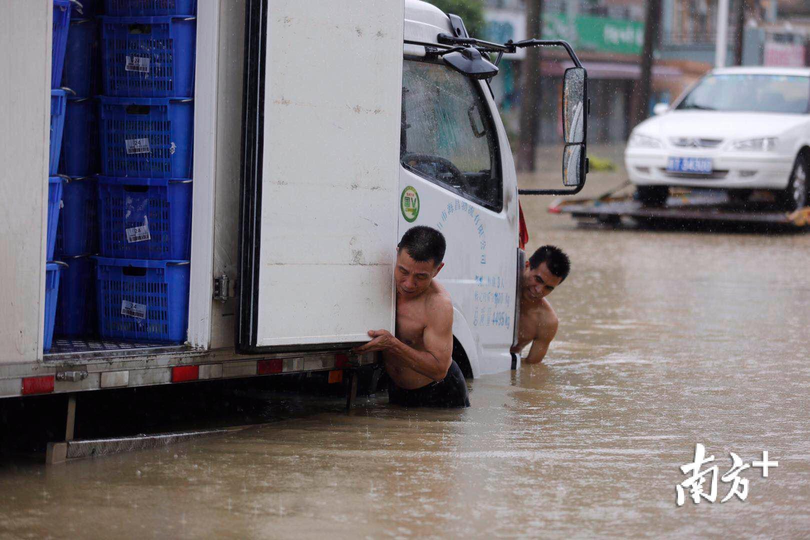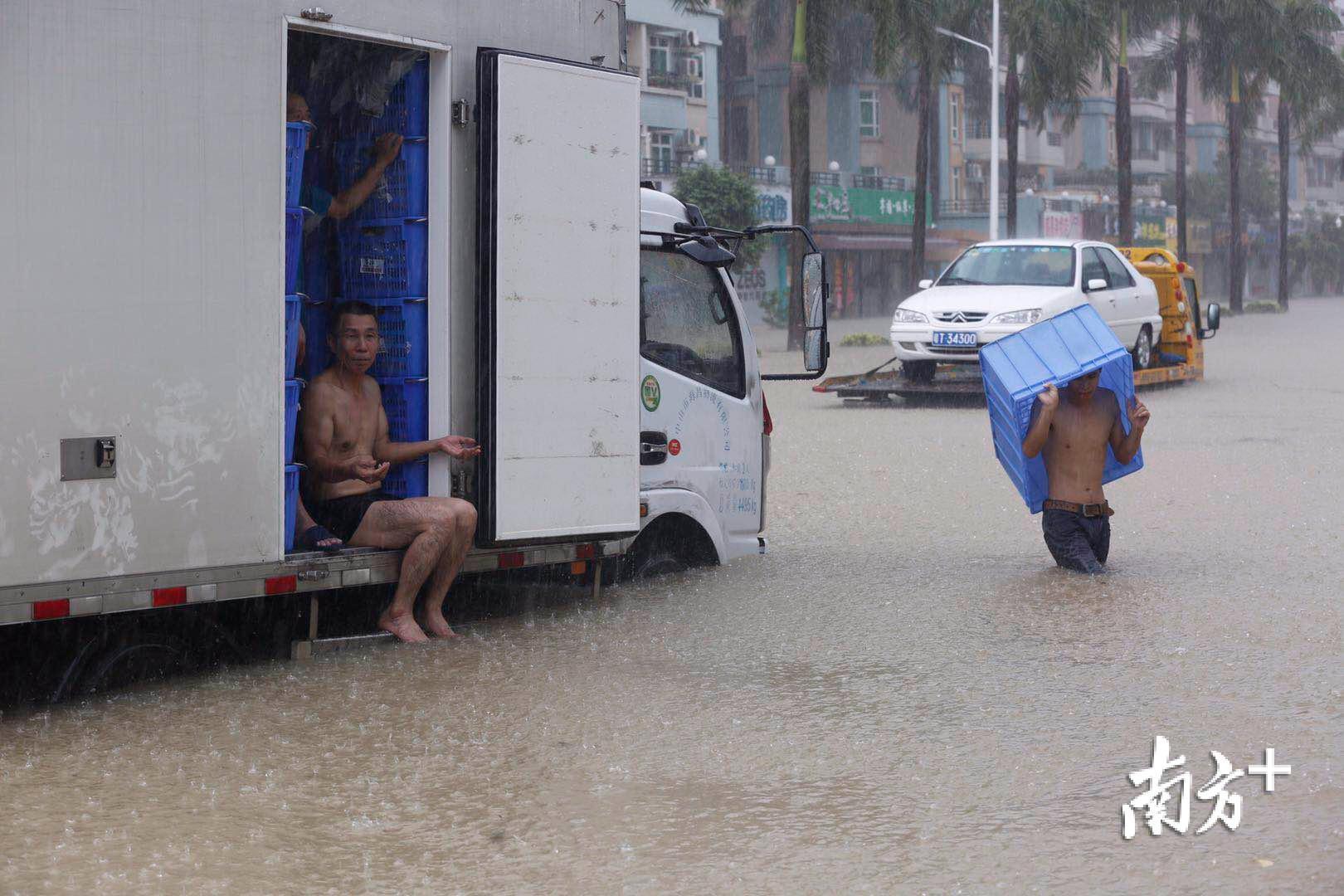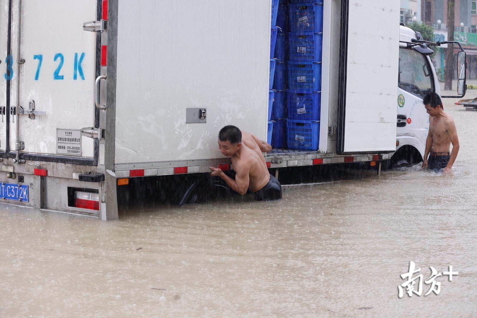 记者来到三乡镇新城路,一辆运输蔬菜的货车被困在积水中。据司机介绍,货车在凌晨两点半开始被困,当务之急是将蔬菜转走。