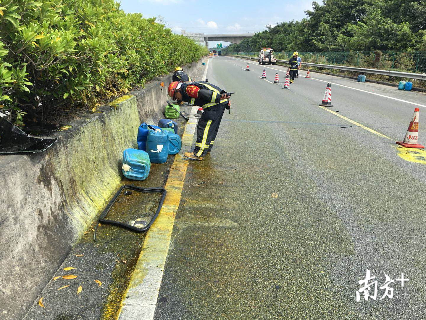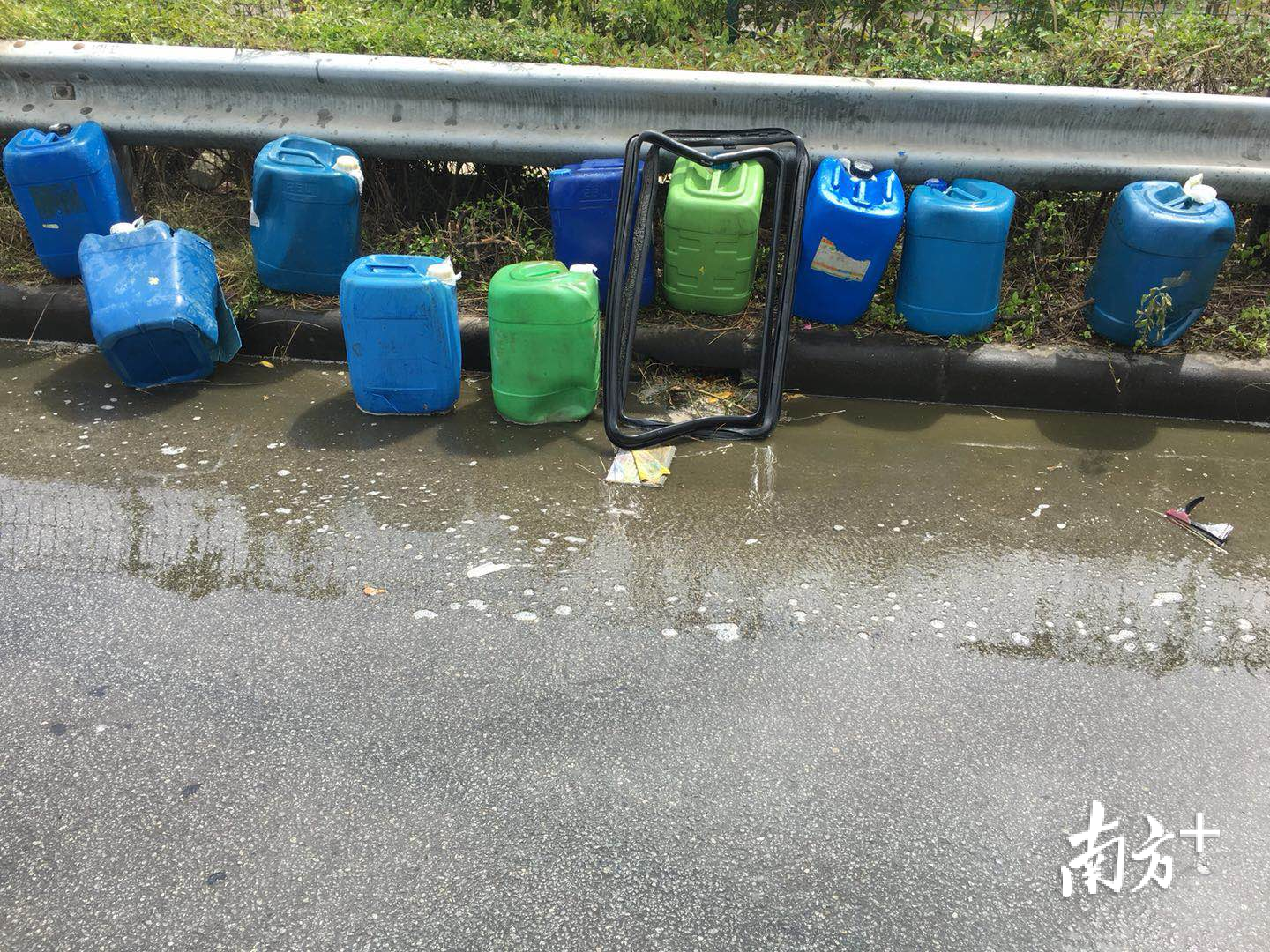 消防员到达现场看到,一辆粤A牌红色挂车停靠在高速路应急道,地上是散落一地载满草酸水的胶桶,远远就能闻到一股刺鼻的酸味,幸好现场没有人员伤亡。