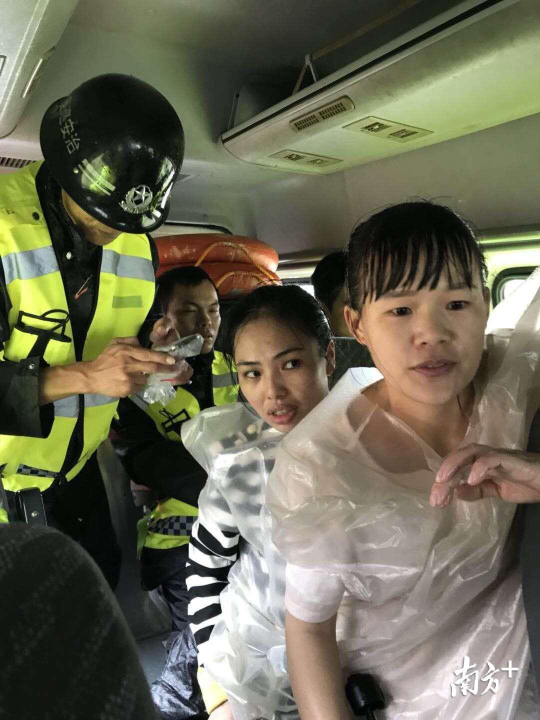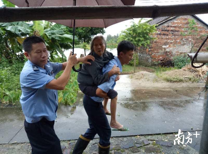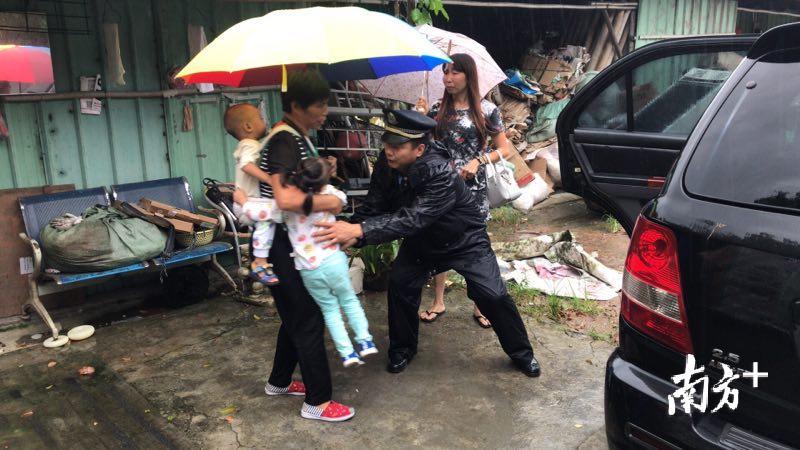 16日,公安局东升分局民警顶着强风,抓紧转移群众。
