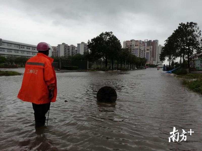 9月17日一大早,市政环卫工人就来到三角镇水浸路段,打开沙井盖加快排水,并在沙井盖旁边守护,防止有路人不慎跌入。