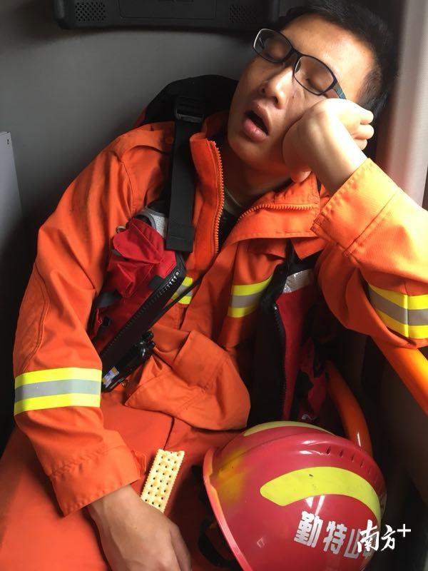 16日晚,中山消防驰援江门救灾。中山消防特勤中队副队长李万主动请缨,率队彻夜搜救,通宵疏散营救被困群众23人。今日早上6:30,他又收到新的求救指令。李万前往救援的路上,由于太疲惫困倦在车上睡着了,手里还拿着咬了半口的饼干。