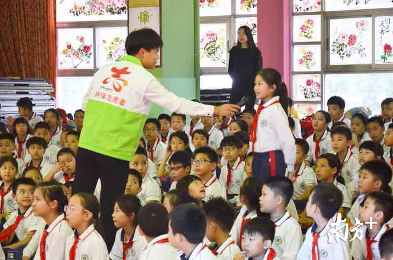孩子们踊跃举起小手,分享生活中节水、惜水的经历,环保志愿者讲精心准备了“环保小卫士”徽章奖励给积极回答问题的学生。