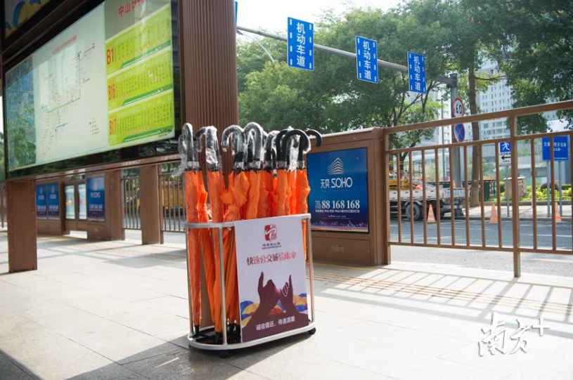 本次“诚信雨伞”活动在中山快速公交延线的13个站台放置了专用雨伞架,供市民按需使用,自助借还。记者在中山日报(BRT)公交站看到,雨伞架就在站台的服务点旁,一把把“诚信雨伞”都插放好。一把“诚信雨伞”可供两个成年人同时使用,可挡雨也可遮阳,伞面上印有“信用中山”的LOGO和中山市的诚信口号“信立天下,诚筑中山”,还有温馨提示语“诚信借还,传递温暖”。