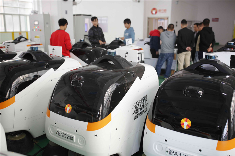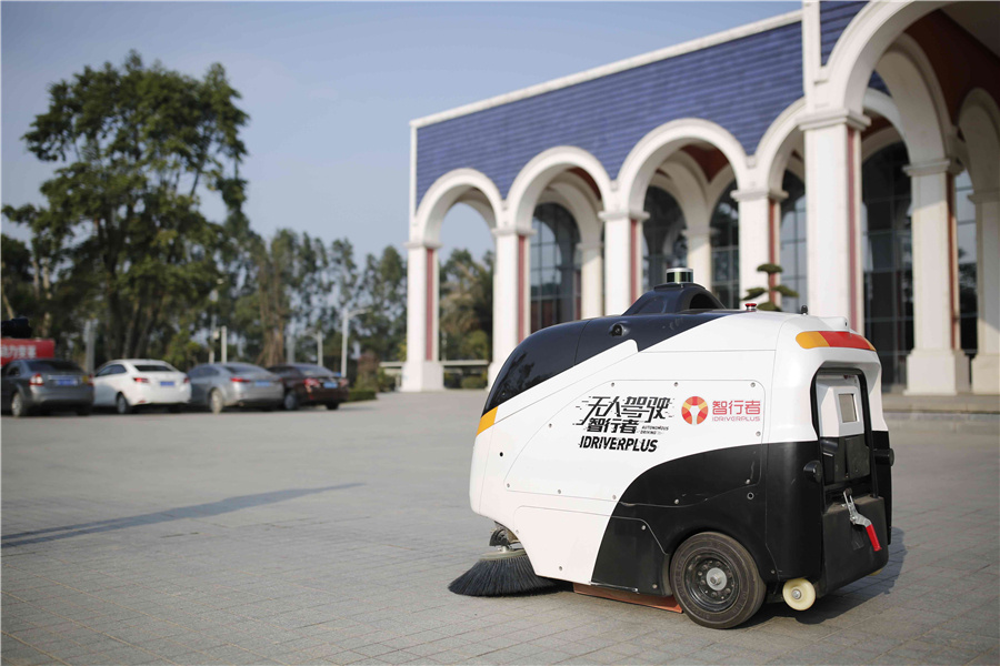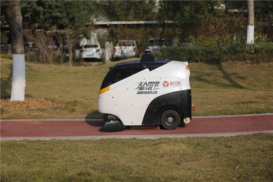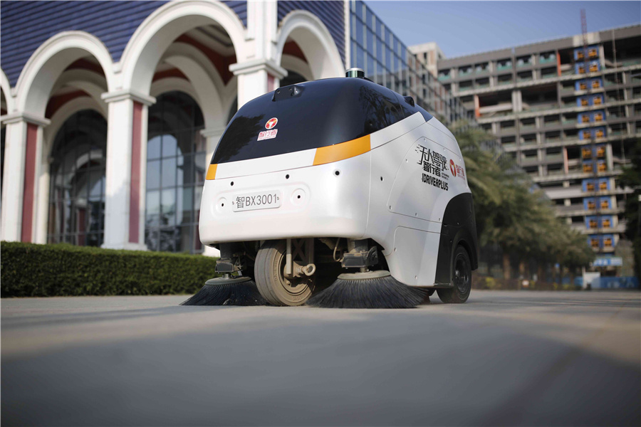这是一台无人驾驶清扫车,它的名字叫“蜗小白”。