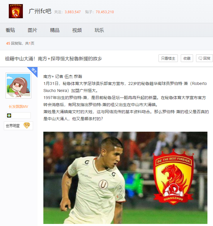 2月2日晚,南方+探寻恒大秘鲁新援祖籍起源的报道一经发出后,引发了众多球迷和中山市民的热议,并被广州FC贴吧等球迷网络平台所转载。