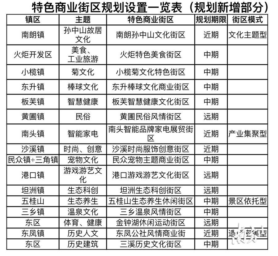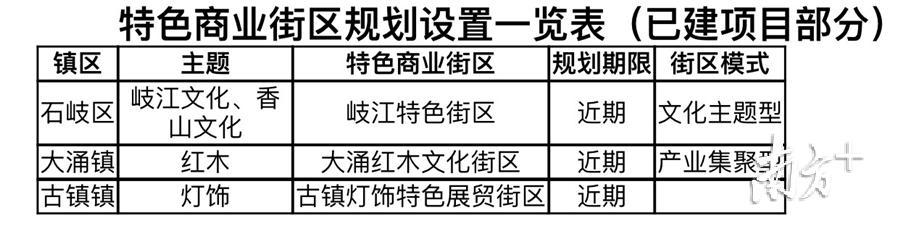关于已建项目提升,对现状存在的商业街区选取消费主题特色鲜明的岐江特色街区、大涌红木文化街区、古镇灯饰特色展贸街区这3个项目纳入全市的特色商业街区规划中,已建商业街区为近期发展重点,通过提升品质和服务,打造旅游购物新地标,通过“以文兴商”的发展模式活化已有商业街区。