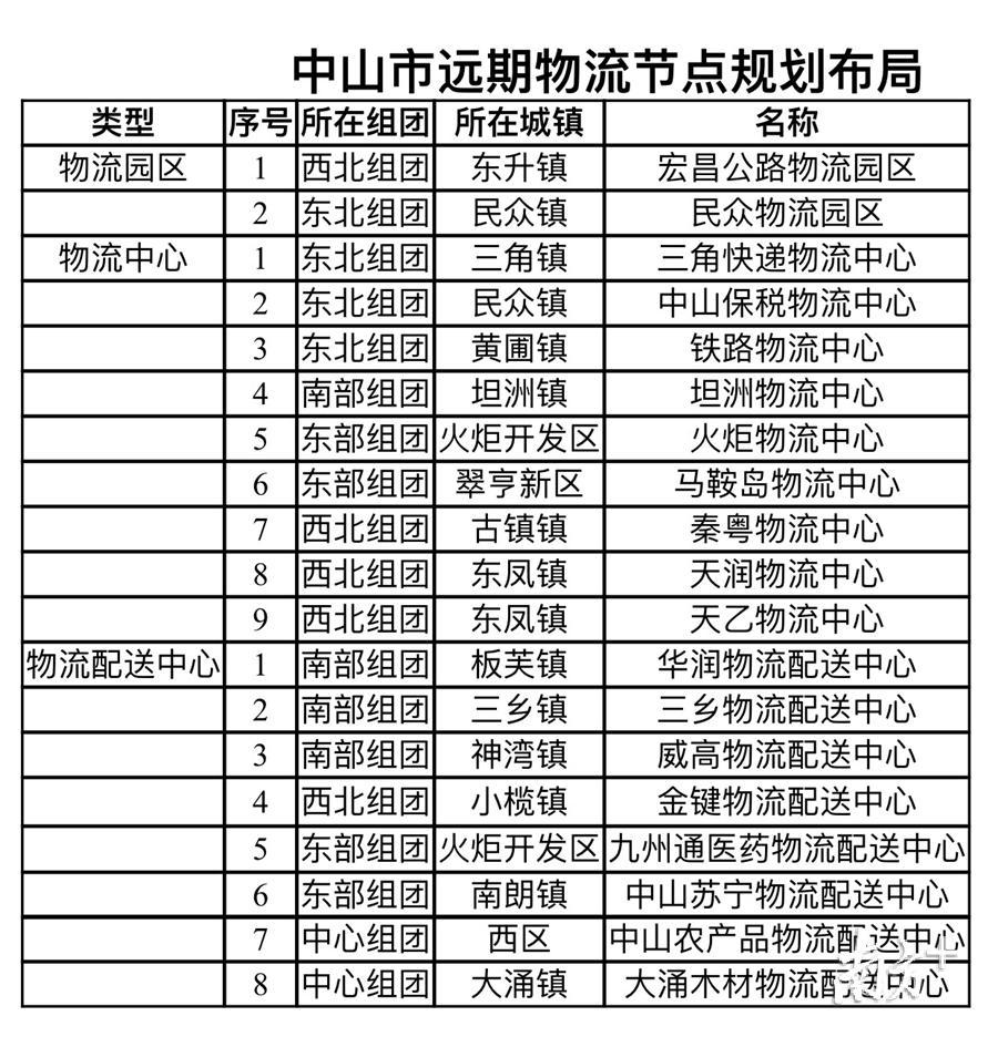 依据“点面结合与开放布局”发展策略和“五大”布局原则,结合中山市与周边城市的交通、区位关系,同时考虑中山市组团式产业发展的特殊情况和现有的物流节点现状,布局远期物流节点。