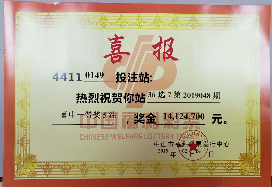 笔者从中山市福利彩票发行中心获悉,这5注大奖属于一张倍投彩票,出自火炬开发区濠头大道46号的44110149号福彩投注站。