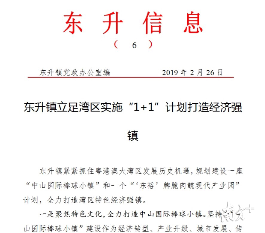 2月27日,东升镇官方网站上发布东升信息——《东升镇立足湾区实施"1+1"计划打造经济强镇》,信息称,东升镇将紧紧抓住粤港澳大湾区发展历史机遇,规划建设一座“中山国际棒球小镇”和一个“‘东裕’牌脆肉鲩现代产业园”计划,全力打造湾区特色经济强镇。