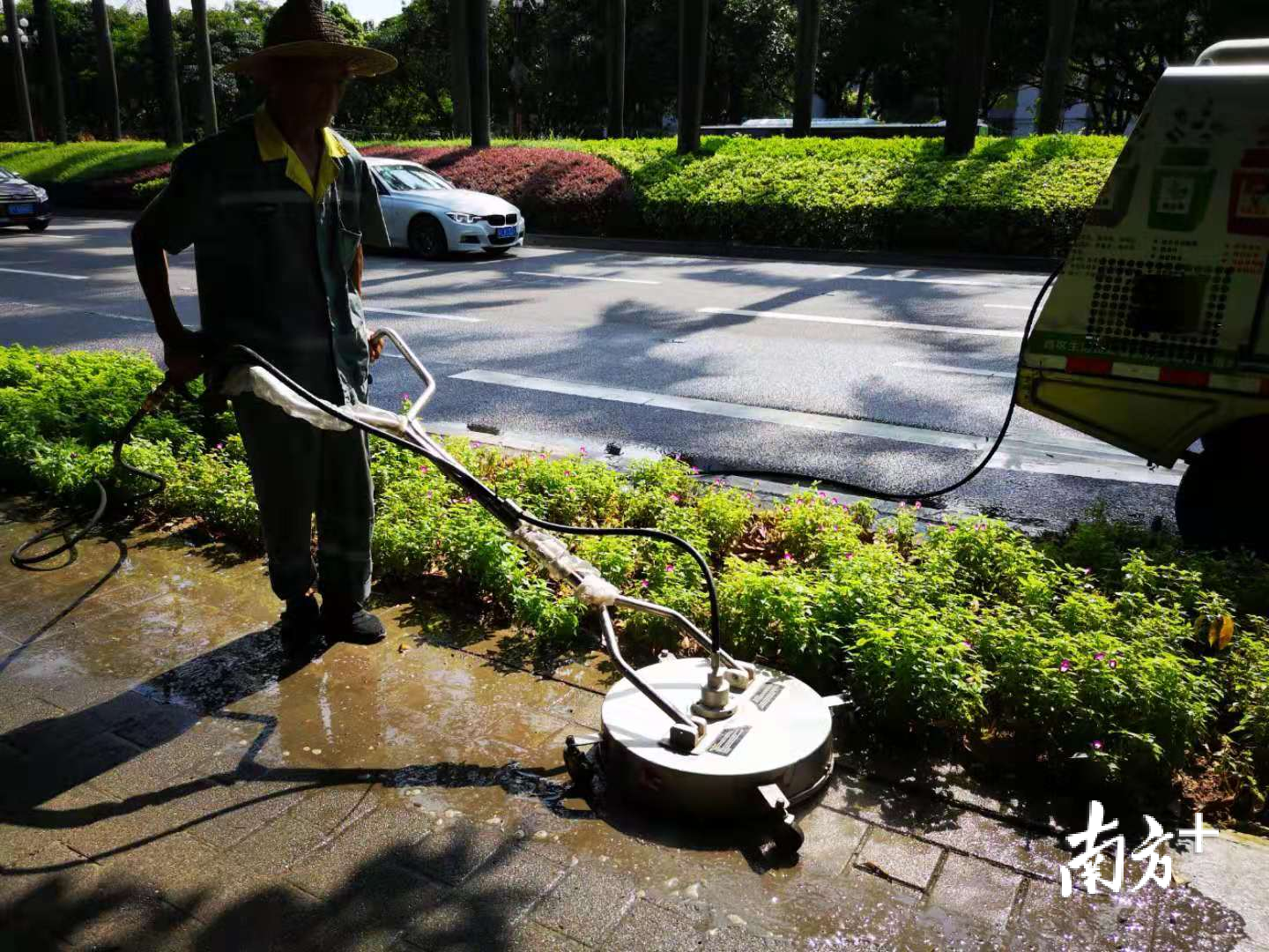 侨银环保中山中心城区项目相关负责人介绍,高压洗地盘能有效消除人行道上滋生的青苔和休闲座椅底下的隐蔽污迹,防止蚊虫滋生。该设备原本多用于写字楼地面清洁保养,公司将其首次引入中山,针对路面、侧石进行精细打磨,高压冲洗,不会对地砖造成伤害,同时大大降低人力劳动强度。