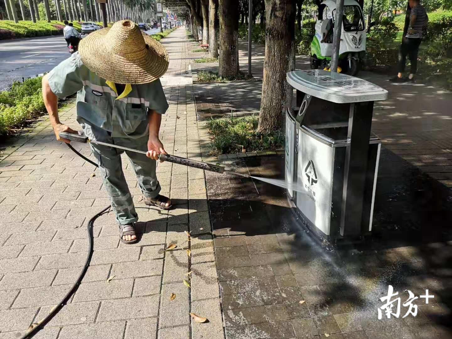 小型高压冲洗车:半分钟能给果皮箱“洗好澡”