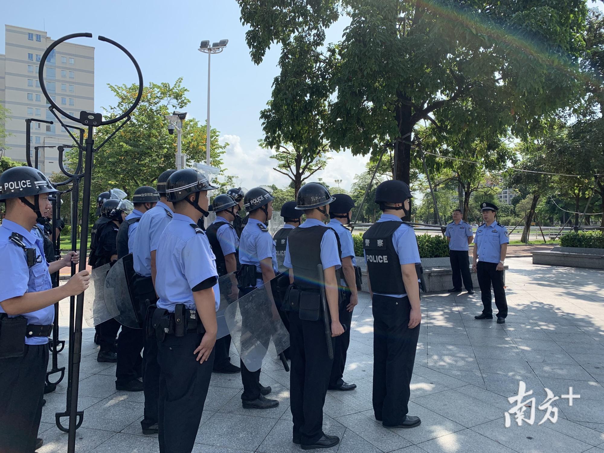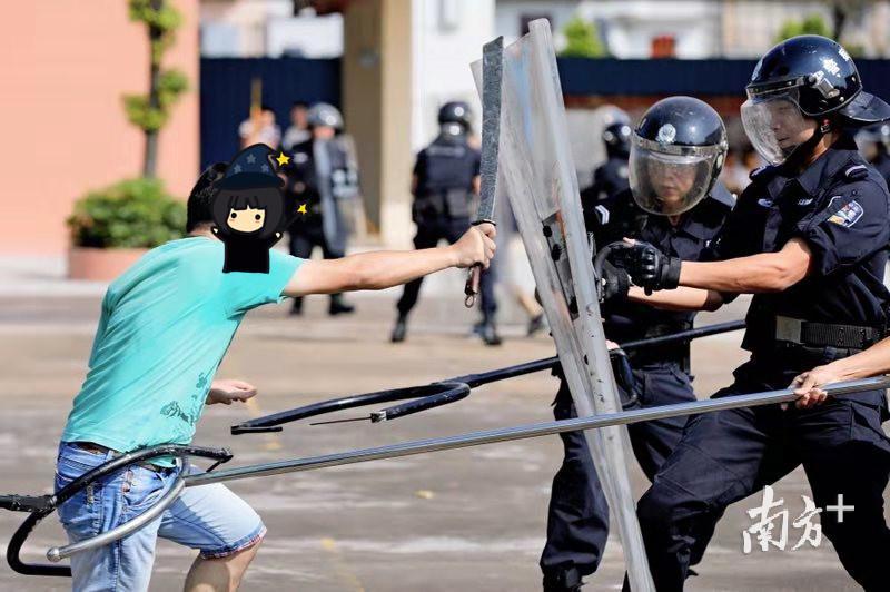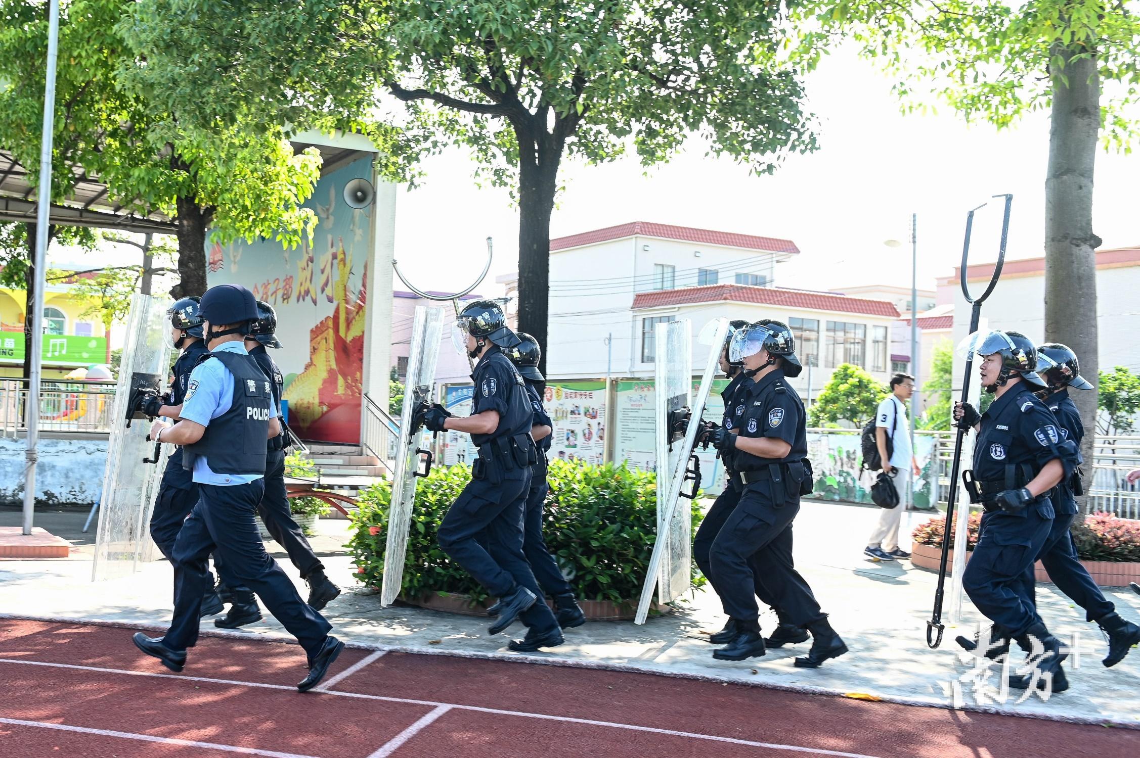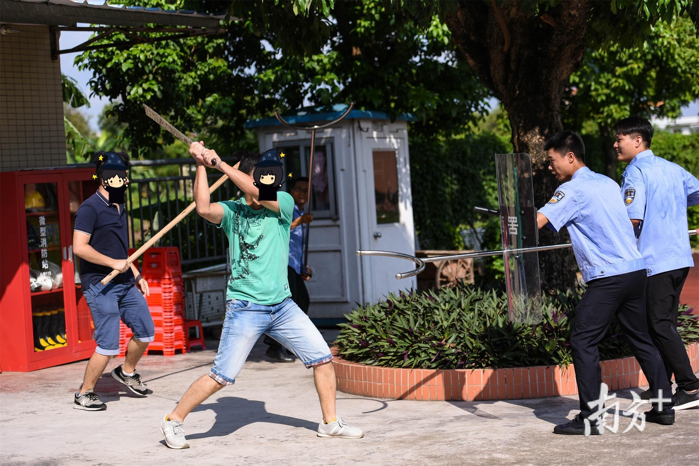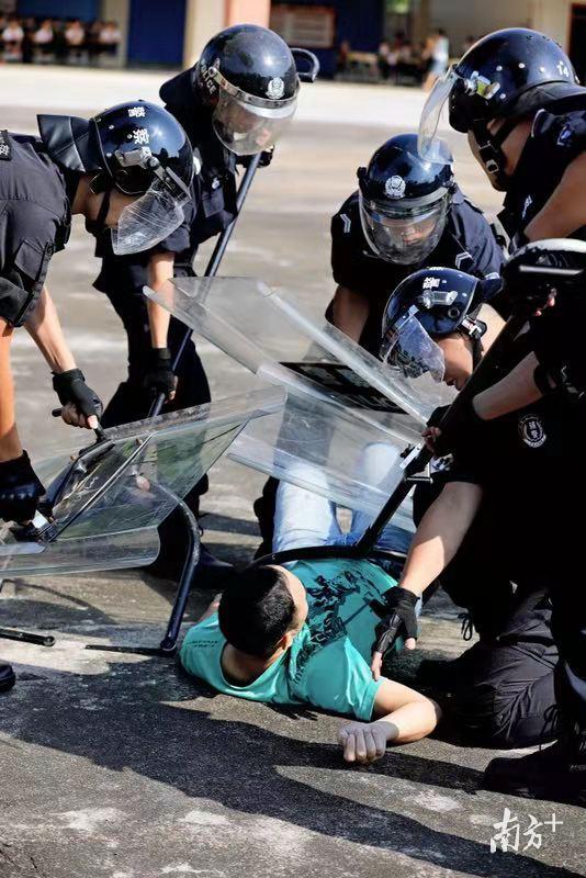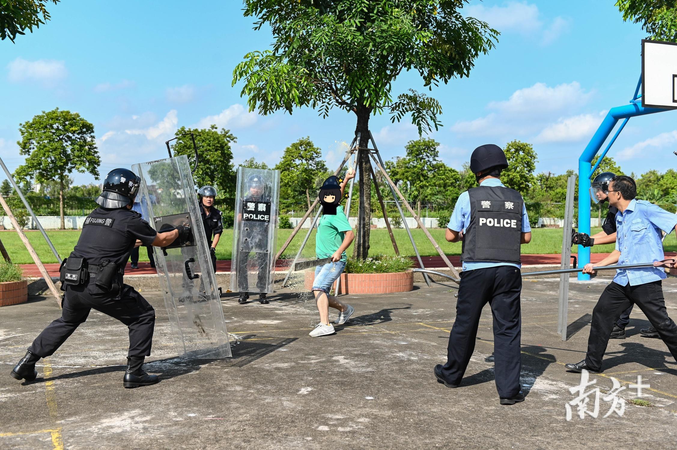 在横沥辖区某小学,两名“社会小混混”手持刀、棍进入校园,在校园保安及治保会人处置的同时,分局街面巡逻警力和辖区派出所人员随后赶到现场,并运用盾牌、警棍等警用装备成功将两名“嫌疑人”拿下归案。与此同时,兴华、同安两个辖区突发的事件也成功处置完毕。