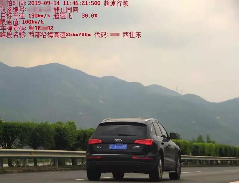 5分钟后,一辆粤TE××92号奥迪Q5小车也沿西往东方向行驶,车速达到了130km/h,超速30%,司机被处以罚款150元的处罚,记6分。▼