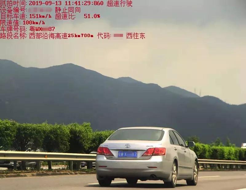 9月13日上午11点41分,一辆粤WX××87号丰田小车在西部沿海高速西往东方向行驶,车速飙到151km/h,可西部沿海高速限速100km/h,超速51%,司机被处以罚款1000元的处罚,记12分。▼