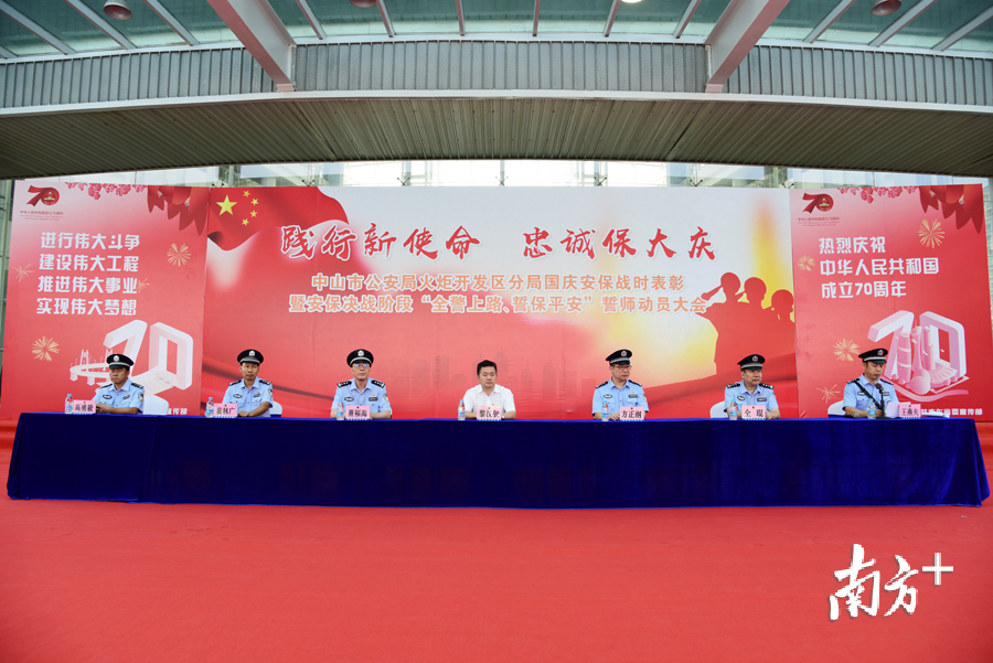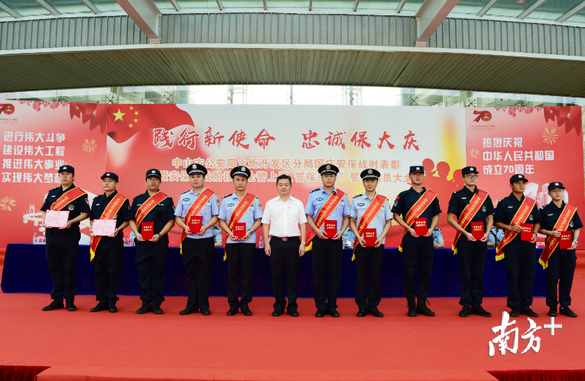 9月16日下午4时,由开发区公安分局主办的火炬开发区国庆安保战时表彰暨安保决战阶段“全警上路 誓保平安”誓师动员大会在区会展中心一号展览馆门口举行。火炬开发区党工委副书记黎汉钊、中山市公安局火炬开发区分局党委班子成员出席大会。