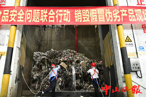 这次销毁的主要是中山市整治食品安全问题联合行动开展期间查获的假冒伪劣产品、农村及校园周边“三无”产品、假冒伪劣保健食品等。