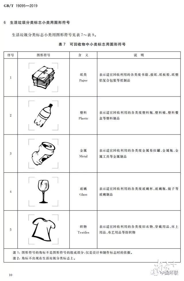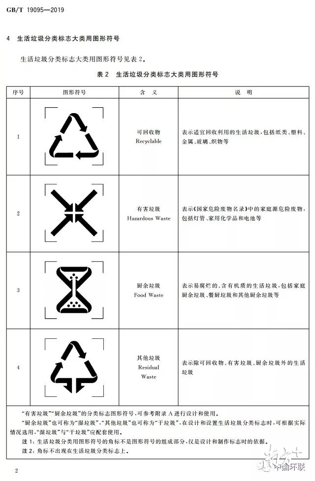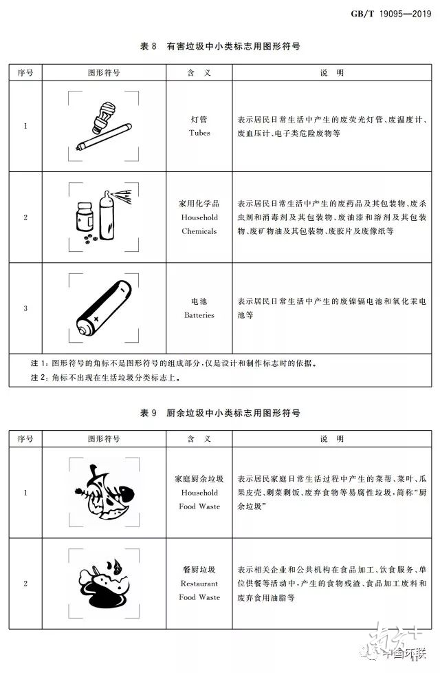 国家市场监督管理总局、中国国家标准化管理委员会日前发布《生活垃圾分类标志》,新标准已于12月1日起正式实施。据介绍,本次修订主要对生活垃圾分类标志的适用范围、类别构成、图形符号进行了调整。相较于2008版标准,标准的适用范围进一步扩大,生活垃圾类别调整为可回收物、有害垃圾、厨余垃圾及其他垃圾4个大类和纸类、塑料、金属等11个小类,标志图形符号共删除4个、新增4个、沿用7个、修改4个。