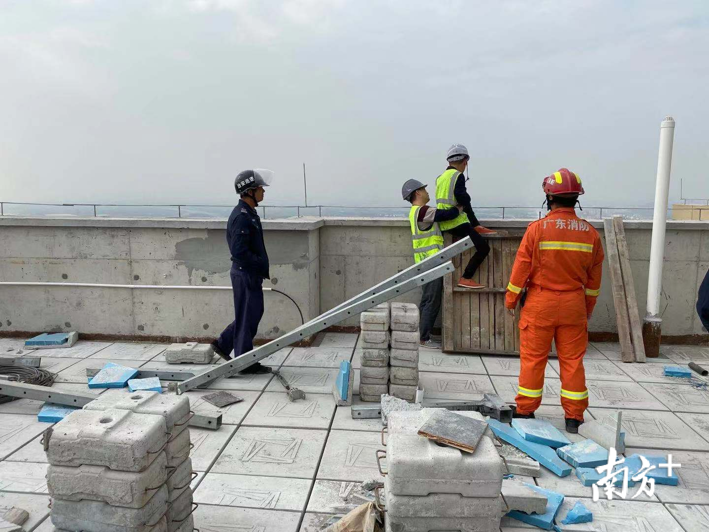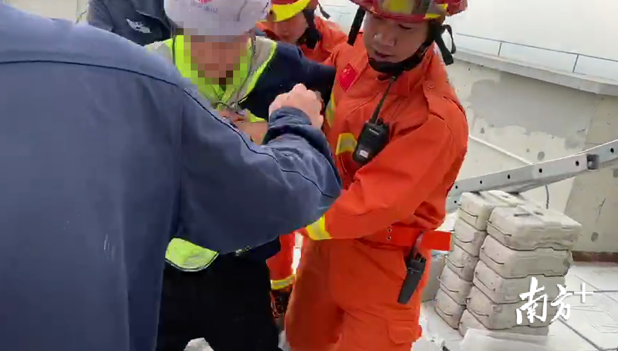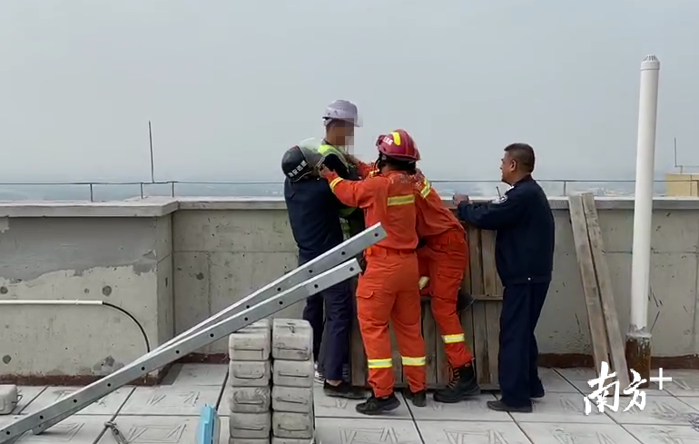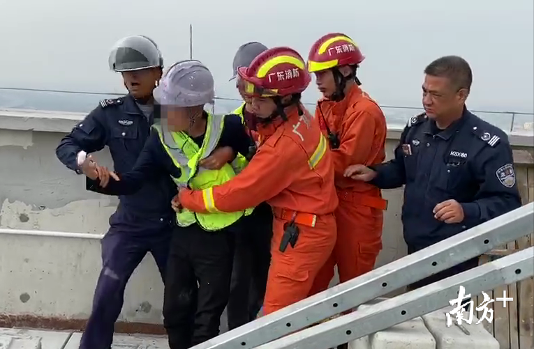 12月15日上午,中山市古镇镇某建筑工地工人周某因手指受伤,向工头索要赔偿2万元,被拒后,他爬上34楼欲跳楼。10时23分,古镇镇第一专职消防队接警后立即赶赴现场,成功将工人救下。