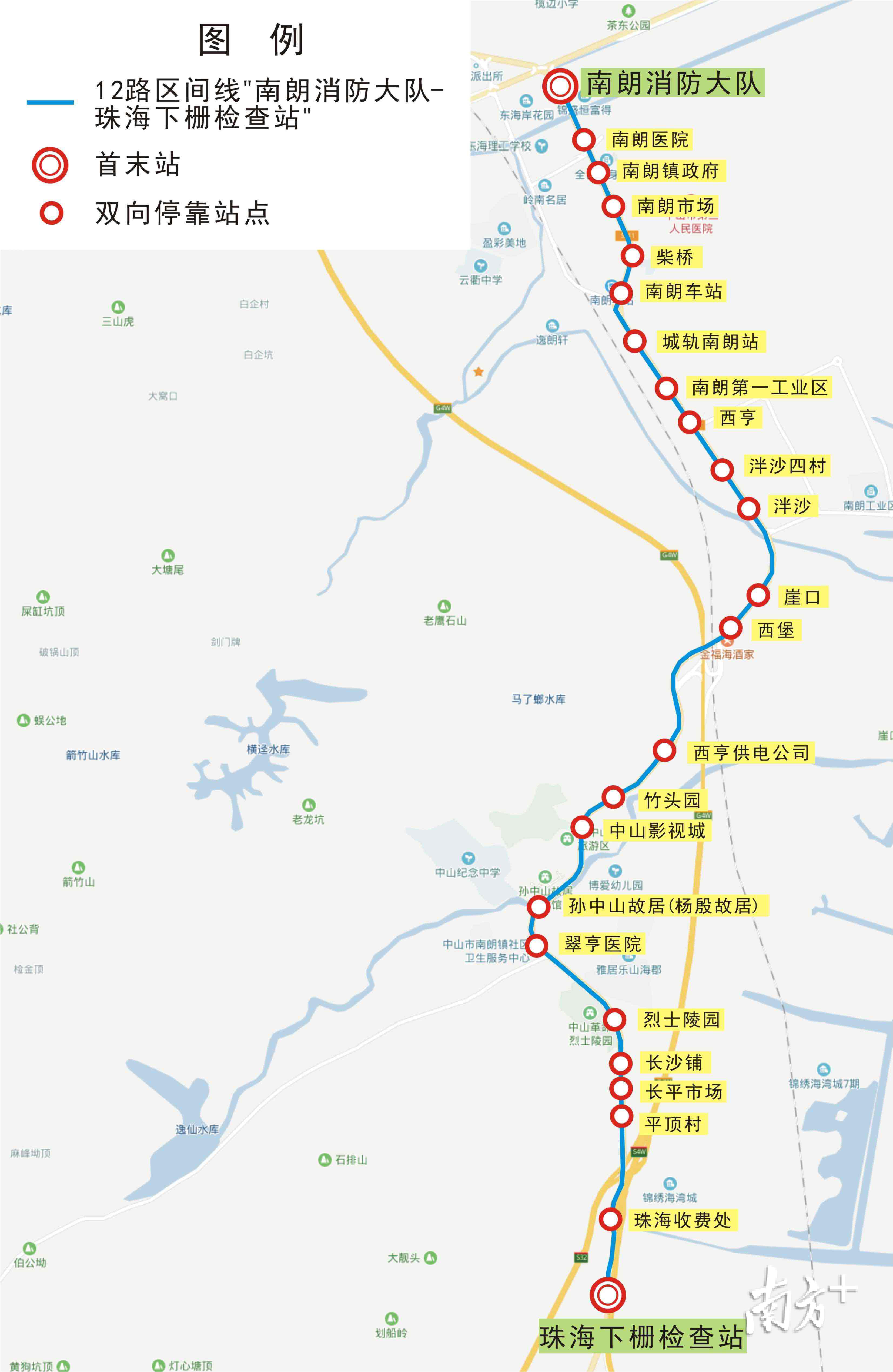 12路线(中山汽车总站——珠海下栅检查站),是连接中山市区与珠海的跨市线路,全程约35公里,客流量大,途经西区、东区、火炬开发区、南朗镇等镇区,终点站为珠海下栅检查站。现增开的区间车是从“南朗消防大队”站开往“珠海下栅检查站”。“南朗消防大队”站发车时间为6:30、6:40、6:50。