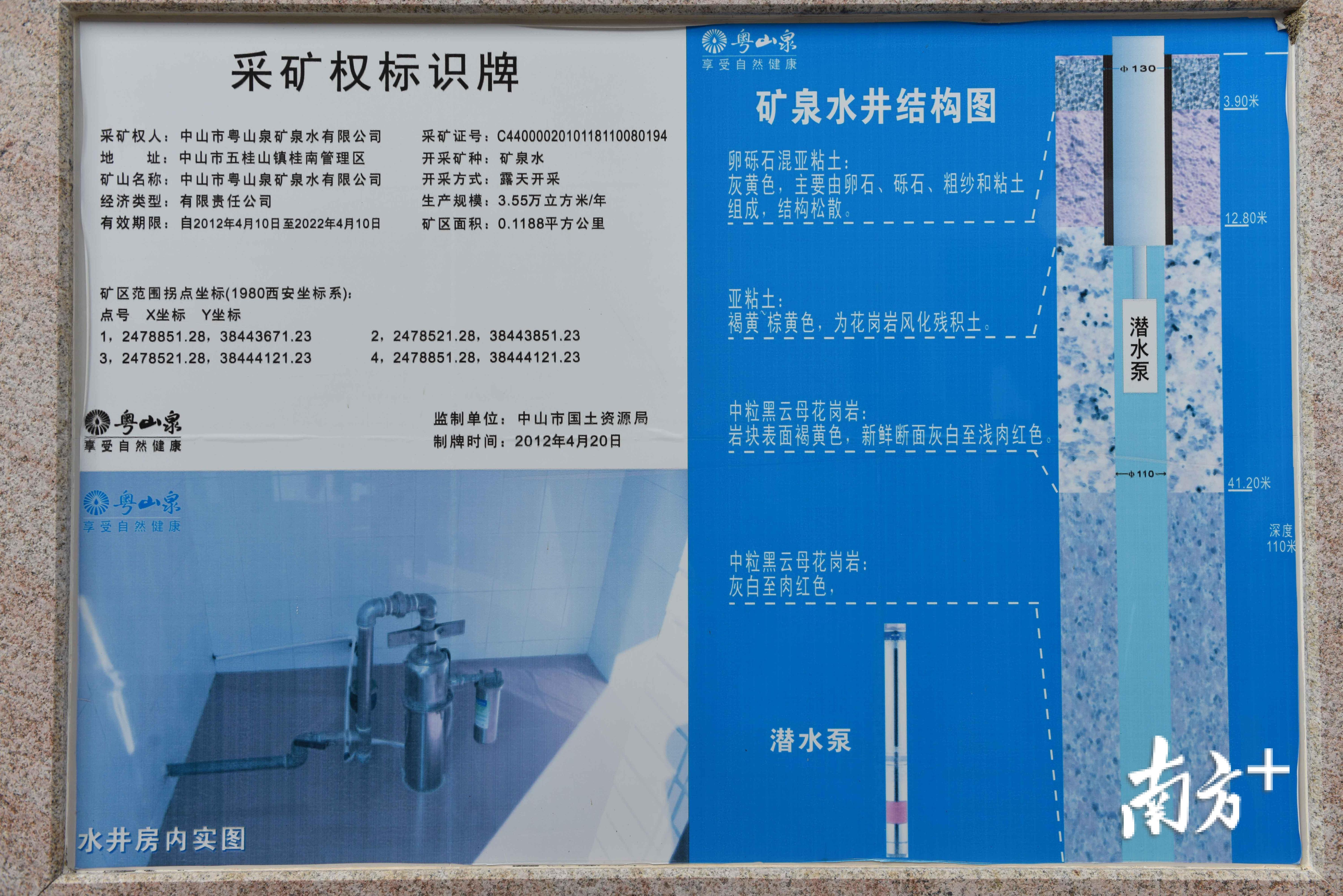 粤山泉取水井锁在一个小房子中,房子外面张贴着“采矿权标识牌”,关上的门由两把锁牢牢锁住。“我们两名管理人员各掌握一把钥匙,取水时必须两人一起打开,仅有一把钥匙是无法取水的。这是为了保证取水的流程规范和安全。”麦东升介绍,这口井有100多米深,直通中粒黑云母花岗岩层, 采用露天开采的方式,开采五桂山山脉地下深层水。为确保取水无污染,平常一般不轻易打开房子的小门。