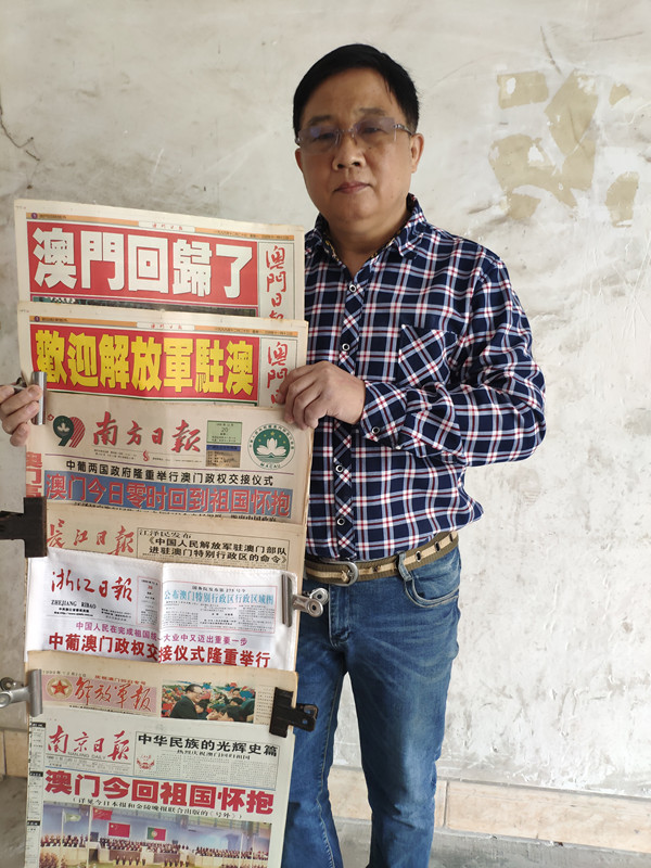 1999年12月20日,人民日报头版头条刊登了题为《中葡两国政府澳门政权交接仪式隆重举行》的文章,报道澳门回归盛况。这张具有纪念意义的报纸来自三乡一家企业的外来务工人员袁美均,12月19日,年近花甲的他在自己宿舍里,向记者展示了600种1000多份澳门回归当天的报纸,将读者的记忆拉回到20年前。