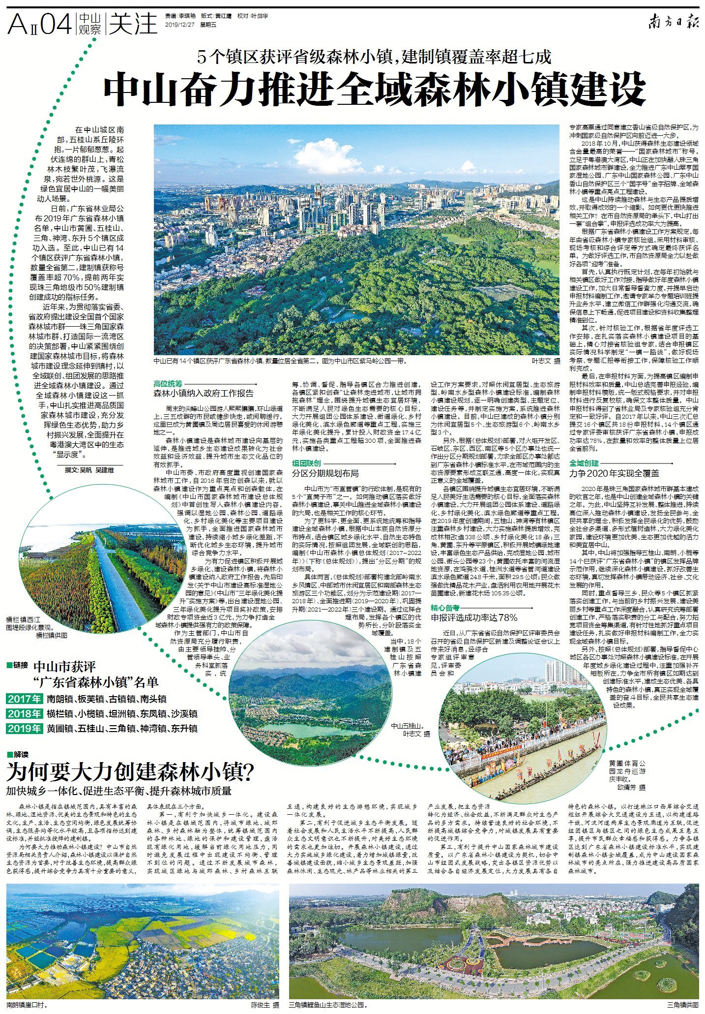 日前,广东省林业局公布2019年广东省森林小镇名单,中山市黄圃、五桂山、三角、神湾、东升5个镇区成功入选。至此,中山已有14个镇区获评广东省森林小镇,数量全省第二,建制镇获称号覆盖率超70%,提前两年实现珠三角地级市50%建制镇创建成功的指标任务。