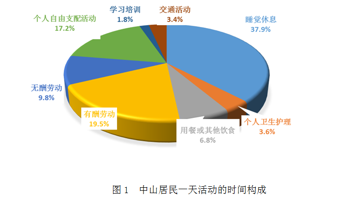 总体来看,中山居民在一天的活动中,个人生理必需活动平均用时11小时36分钟,占全天的48.3%;有酬劳动平均用时4小时41分钟,占19.5%;无酬劳动平均用时2小时22分钟,占9.8%;个人自由支配活动平均用时4小时8分钟,占17.2%;学习培训平均用时25分钟,占1.8%;交通活动平均用时48分钟,占3.4%。