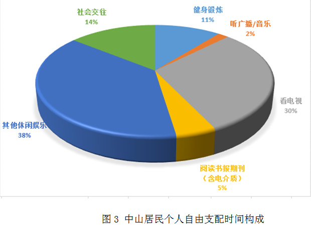 中山居民一天中自由支配活动平均用时4小时8分钟,比全国多12分钟,比全省多3分钟。