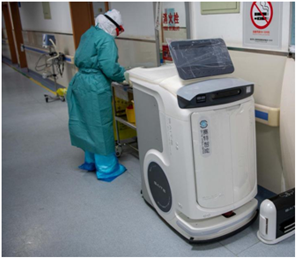 根据实际运行效果测算,每台机器人可替代三名配送员的工作量。机器人的应用在成本节省以及预防交叉感染方面也卓有成效。由于该款机器人内部有自动消毒净化功能,外壳材质也是用抗腐蚀的医疗材料制成,只需用酒精喷洒或消毒巾擦拭十几秒即可完成消毒,让医护人员工作更安全、更高效。