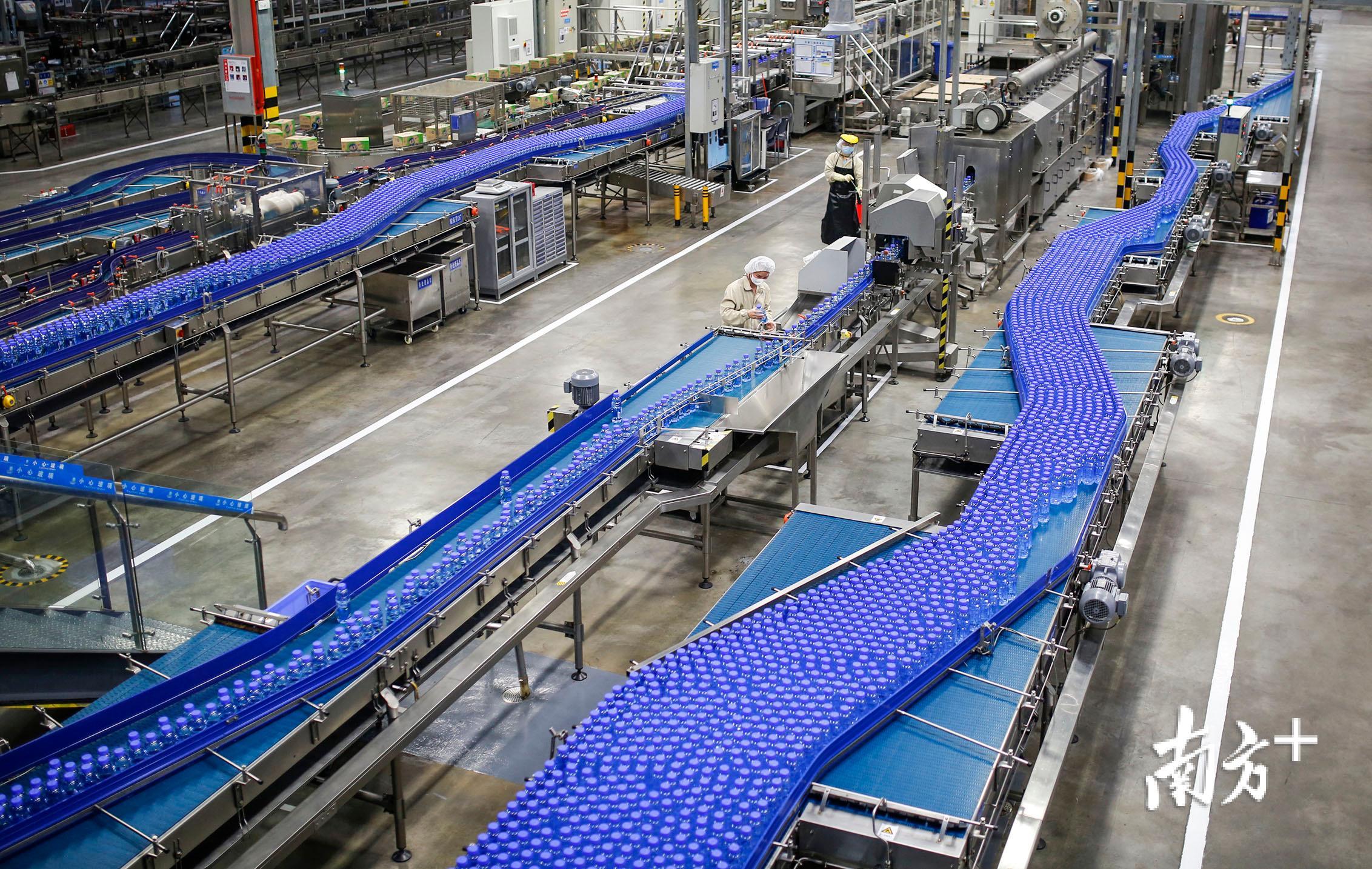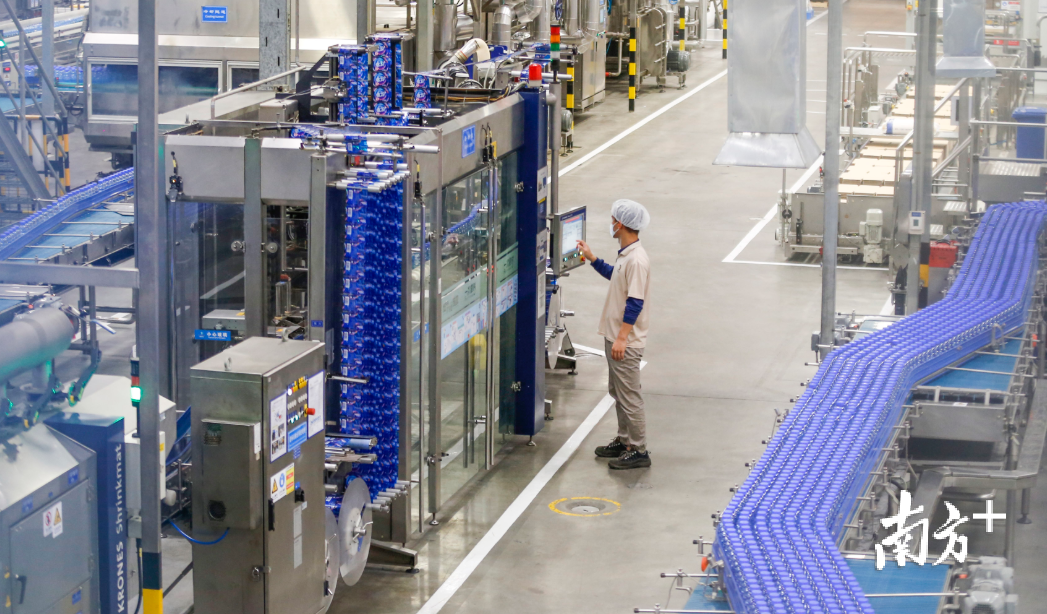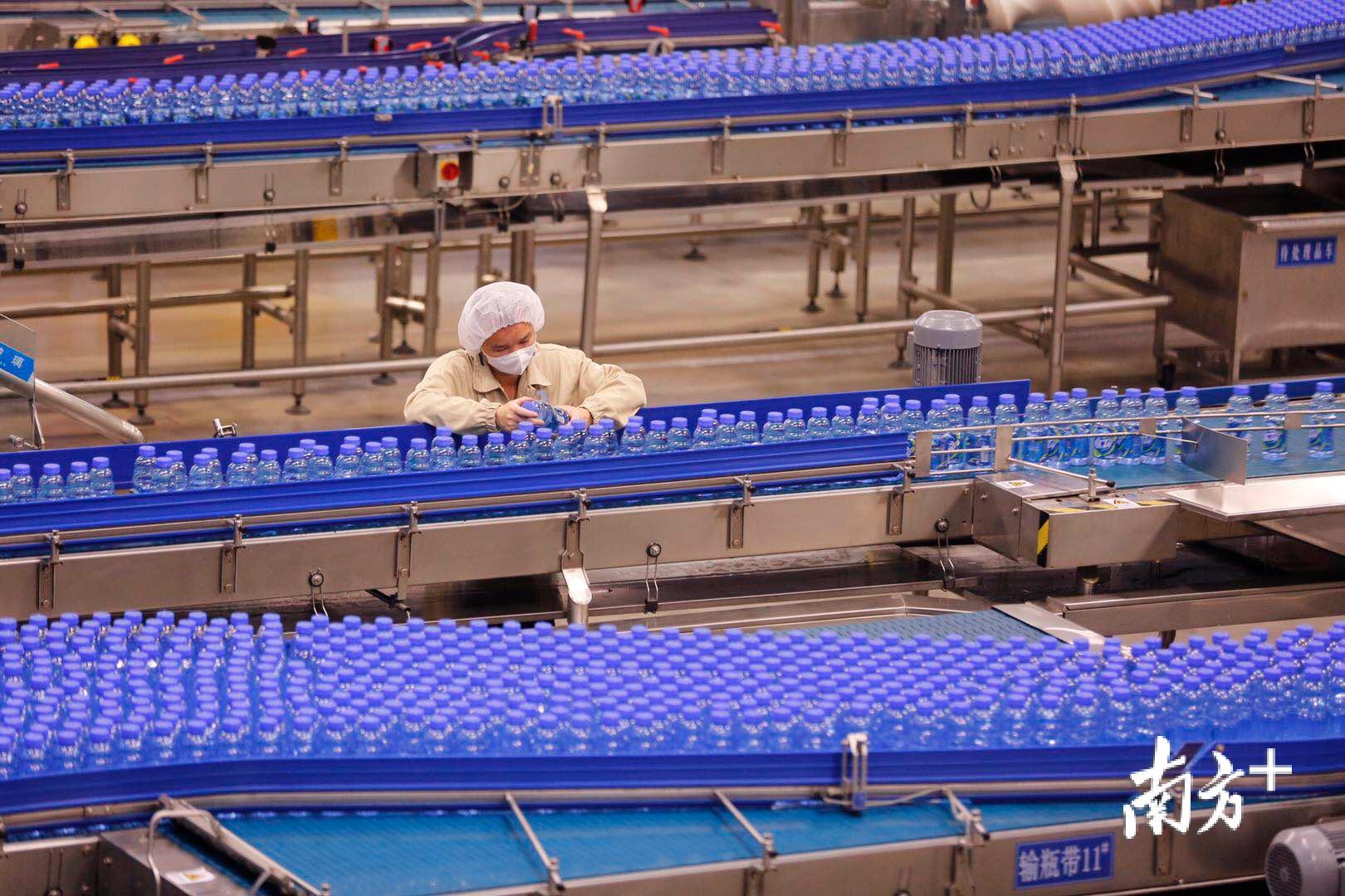 包装车间内,“脉动”的蓝色瓶子在全自动的生产线上流动,繁忙的生产线在机器的轰鸣声中完成了饮料从调配到灌瓶再到装箱的全过程。仅一条包装车间的生产线,在不到10名员工的监督下,一天可以完成5万箱的日产量。达能(中国)饮料党支部书记、质量控制经理潘永浪说:“包装车间共有4条生产线,目前2条已经复产。另外2条正在检修中,这两天内便会投入生产。”