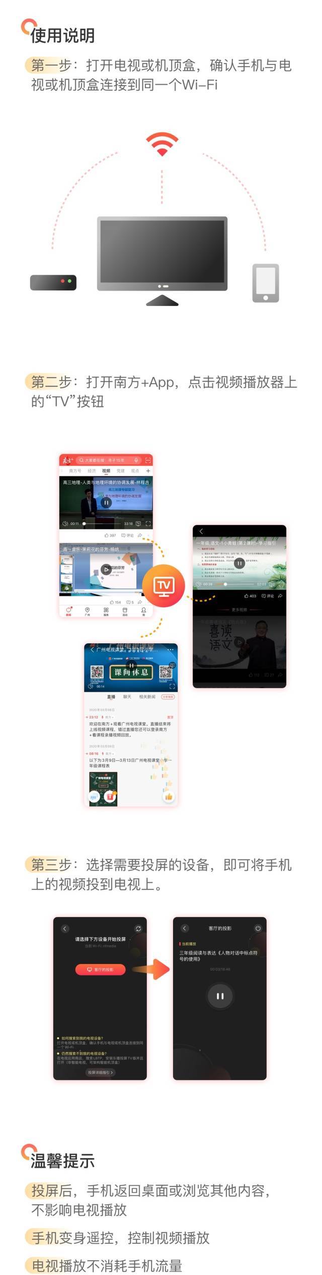 用户更新或下载南方+6.4.5版本客户端后,打开App,点击视频播放器上的“TV”按钮,即可实现一键投屏到电视上观看,《粤课堂》和珠三角九市网课一网打尽。点击直达:流畅!珠三角网课九城全覆盖,名校名师名课尽在南方+