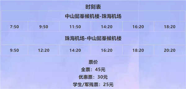 从中山往返珠海机场乘机的旅客方便了。 记者从中山懿峯候机楼票务有限公司获悉, 中山懿峯候机楼到珠海机场专线明日(3月31日)开通试运营。最早早上7:50起发车,一天六班,全程票价45元。