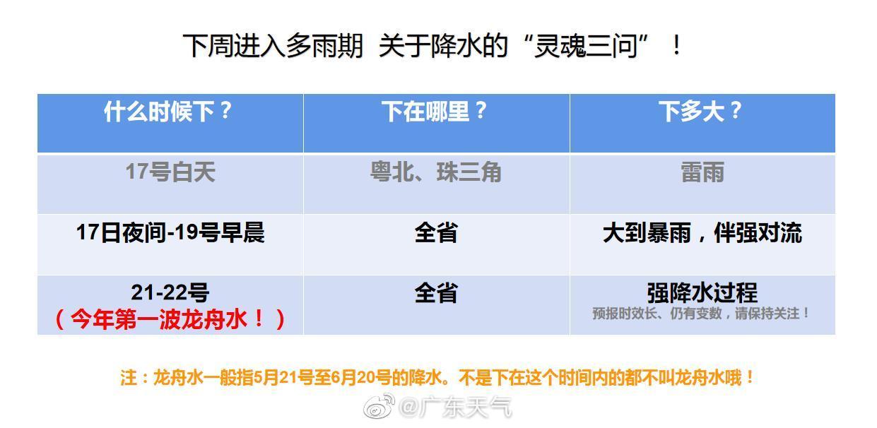 事实上,下周广东全省将进入多雨期,未来一周,我省将有两次明显降水过程,并伴8级左右雷雨大风,强降雨时段在18日和21-22日(今年第一波“龙舟水”)。其中,17日夜间-19日早晨珠三角、粤东和阳江、茂名有大雨到暴雨,其余市县有大雨局部暴雨,19日白天到20日我省雨势减弱,21-22日我省大部又有一次强降水过程。